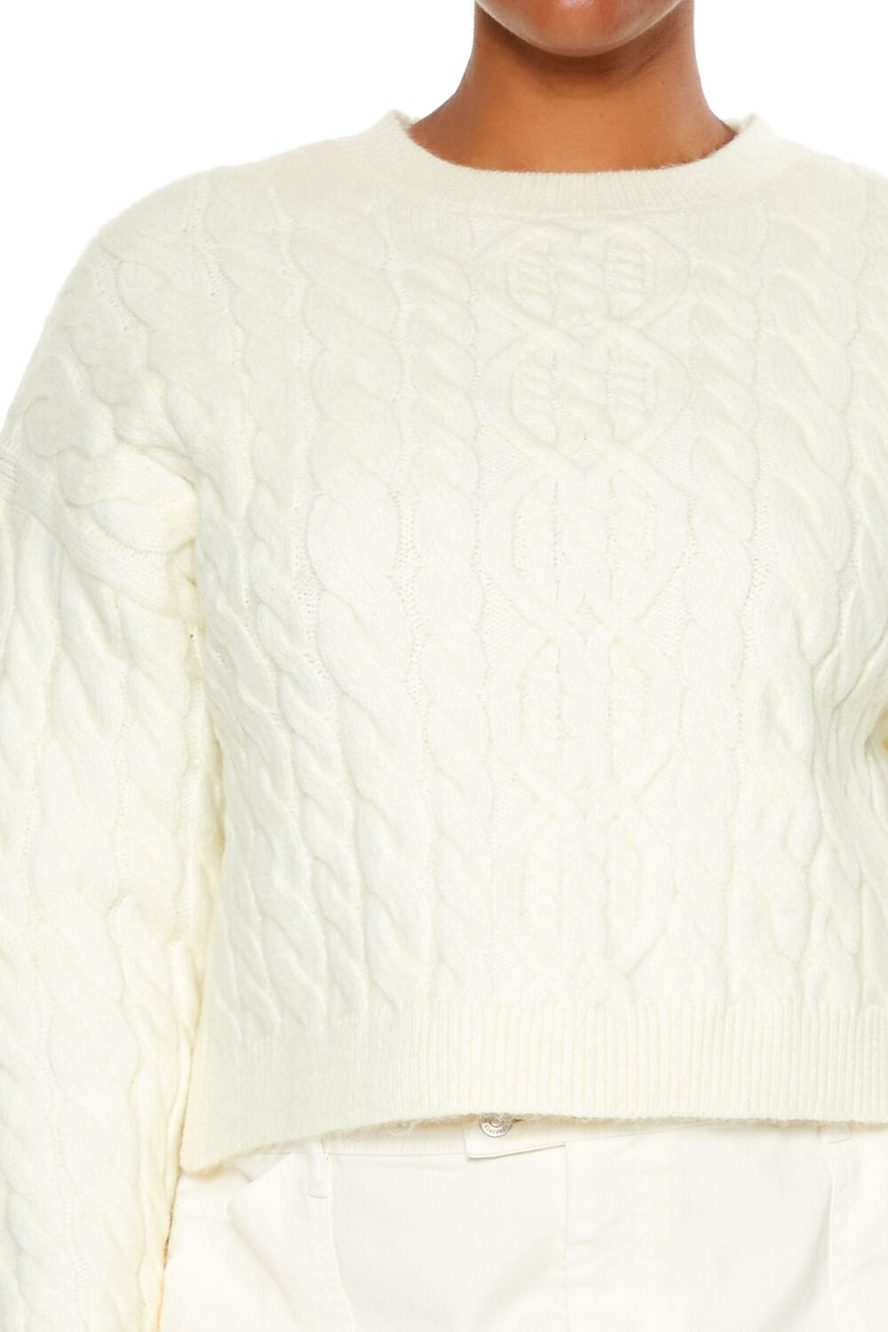 Forever 21+ – A cable knit sweater featuring a crew neck. dropped long sleeves. ribbed trim. and semi-cropped hem.