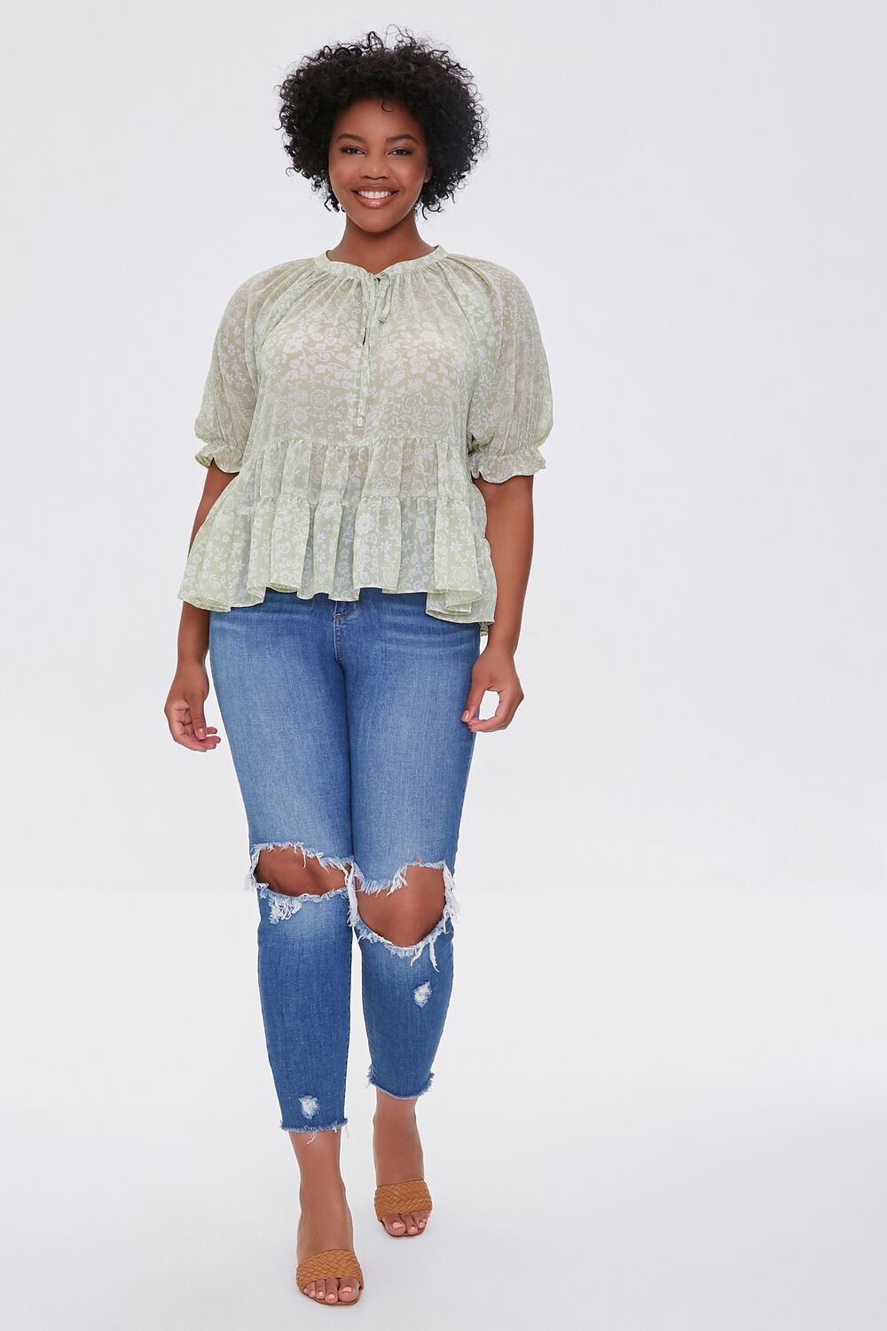 Forever 21+ – A woven top featuring an allover floral print. short sleeves. ruffle trim. and a self-tie round neckline.