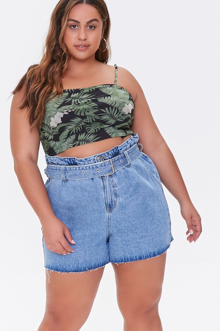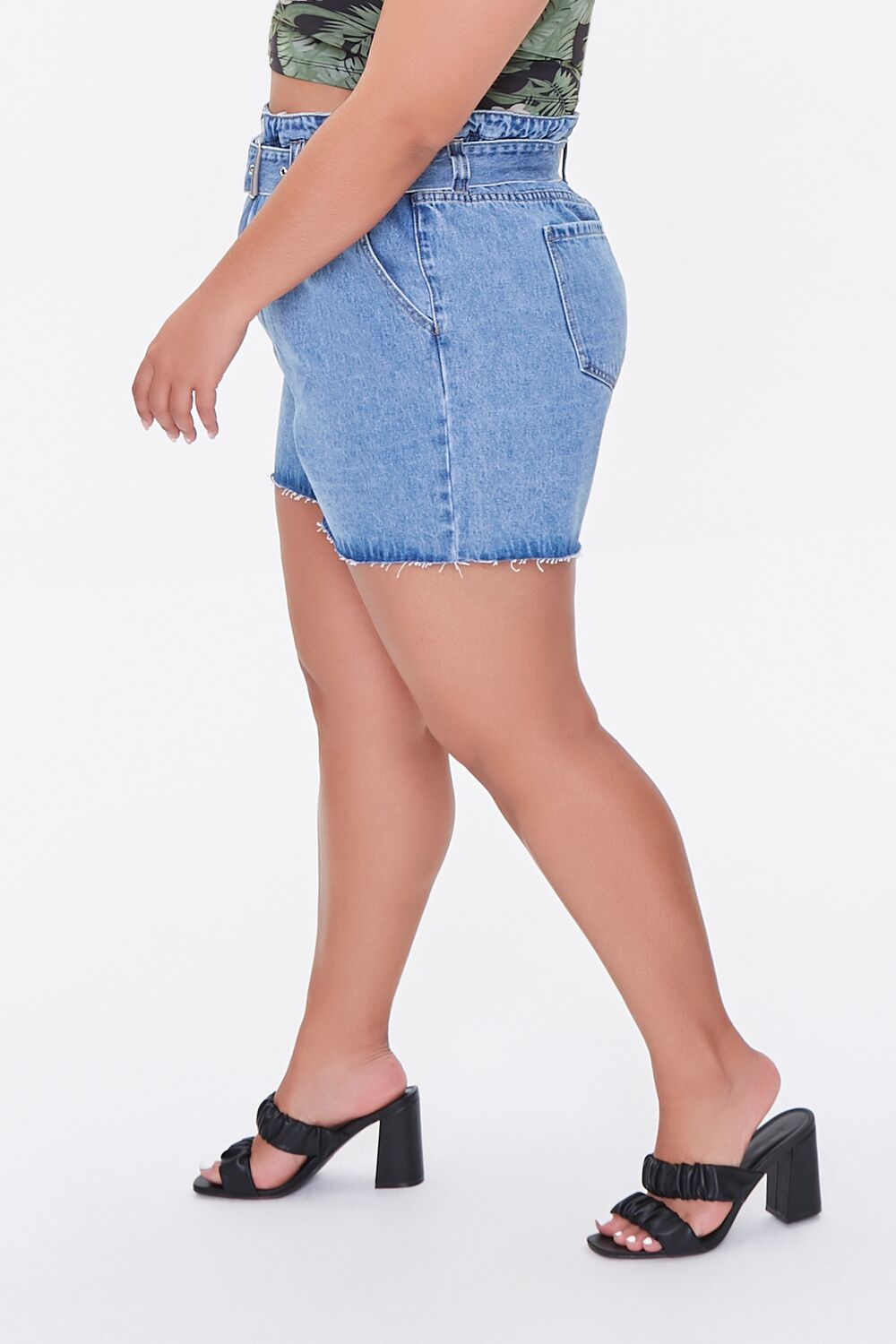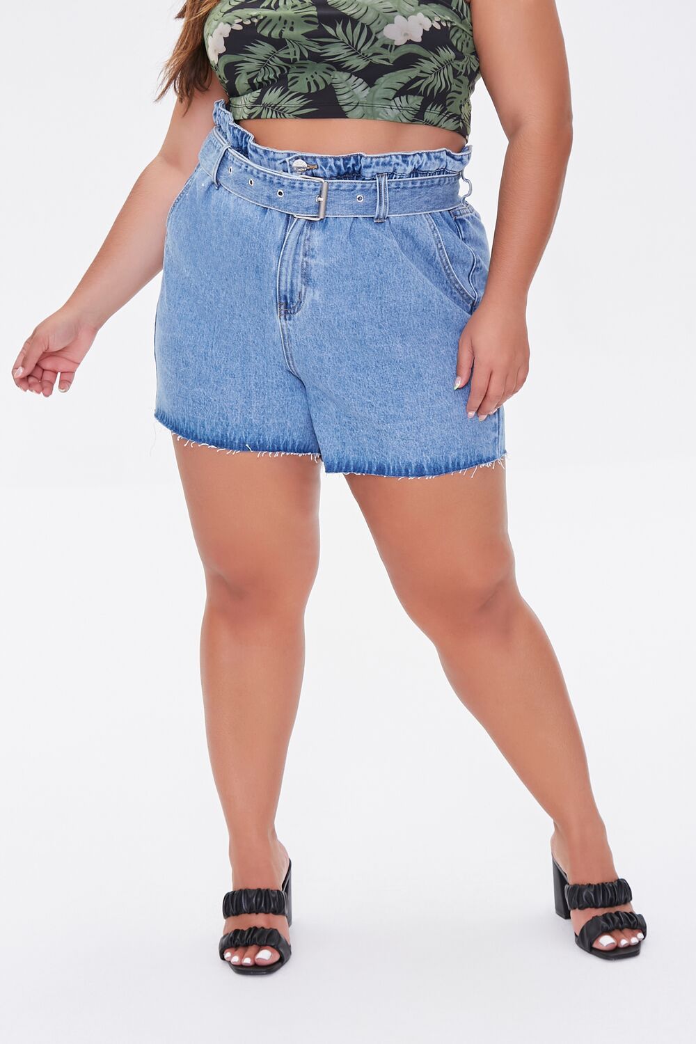 Forever 21+ – A pair of denim shorts featuring a high rise paperbag waist with a belt. four pocket construction. and a raw-cut hem.