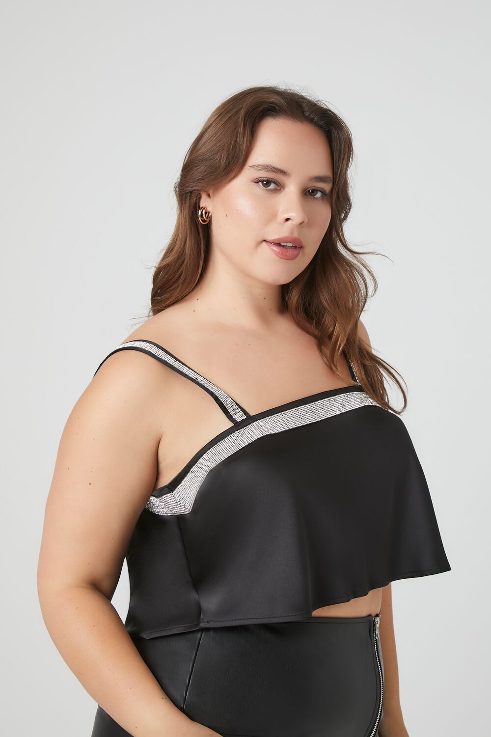 Forever 21+ – A satin tank top featuring rhinestone trim. a square-cut neckline and back. shoulder straps. and cropped hem.