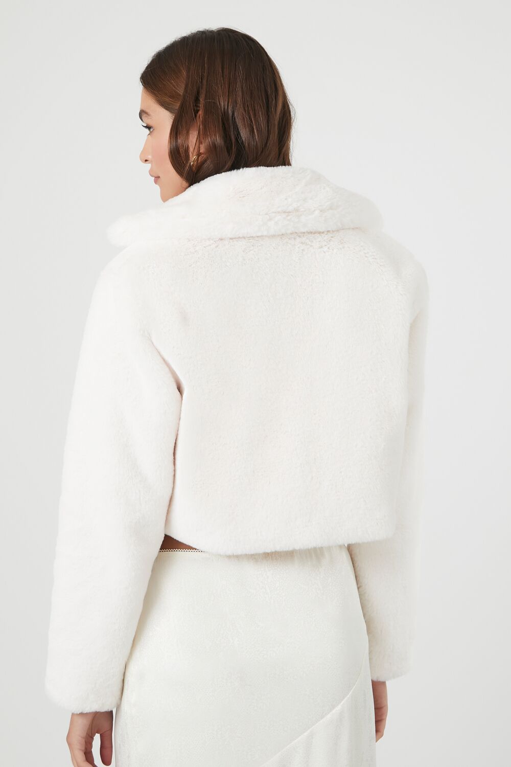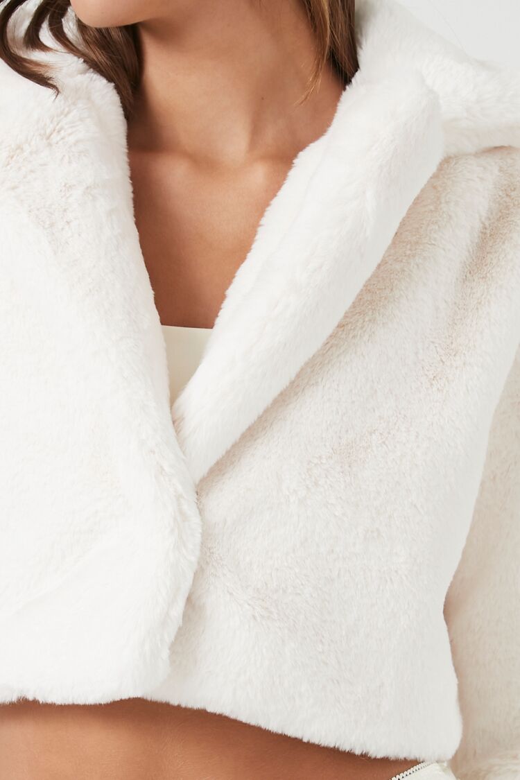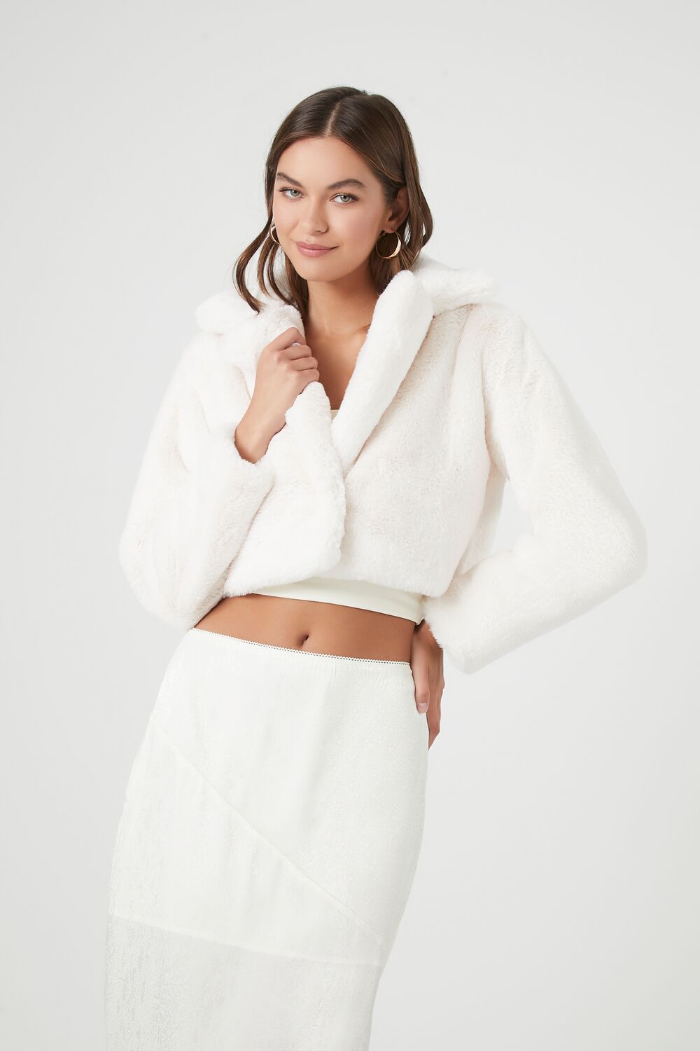 A plush faux fur coat featuring notched lapels. long sleeves. and a cropped hem.