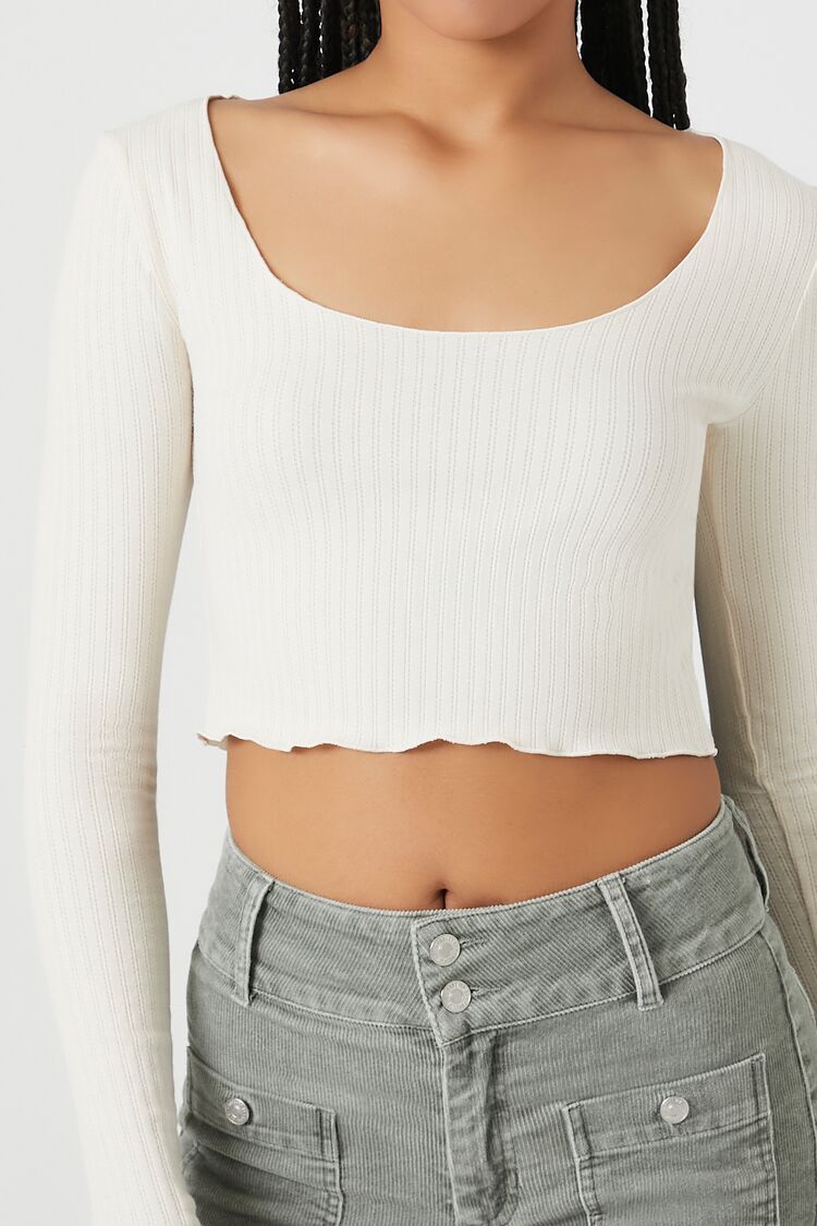 A Pointelle knit crop top featuring a round neckline. long sleeves. and lettuce-edge trim.