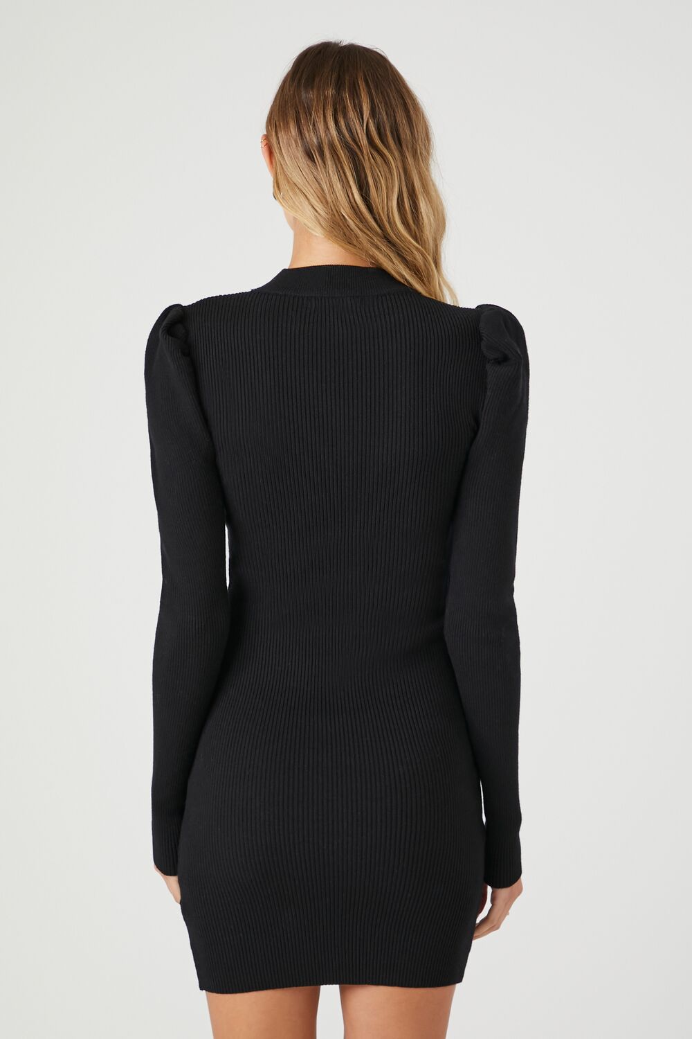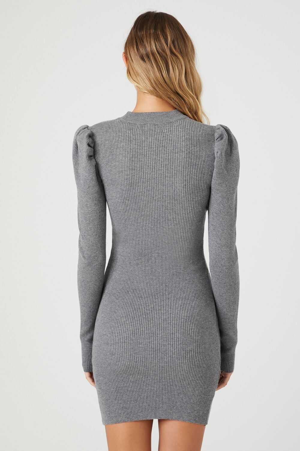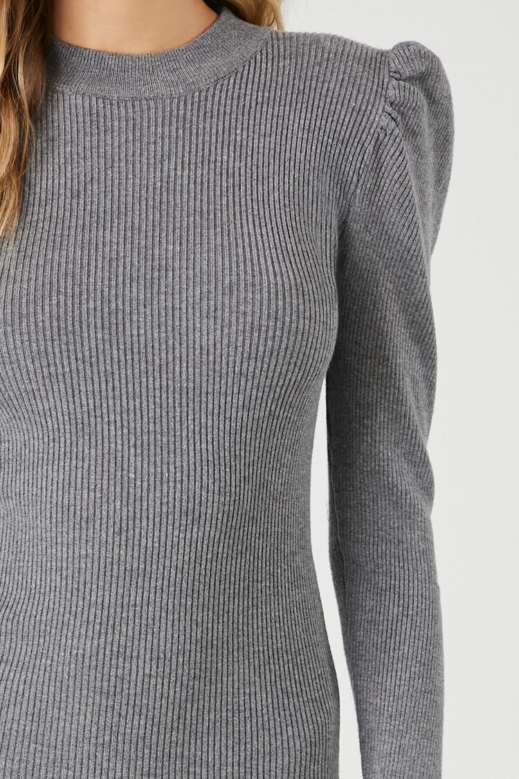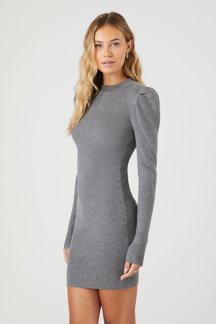 A knit mini sweater dress featuring a round neckline. long puff sleeves. and a bodycon silhouette.
