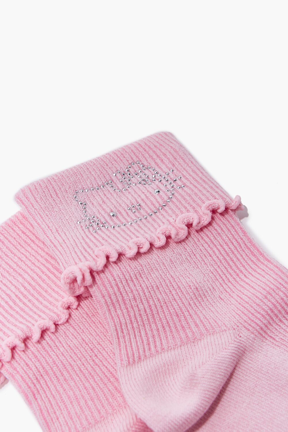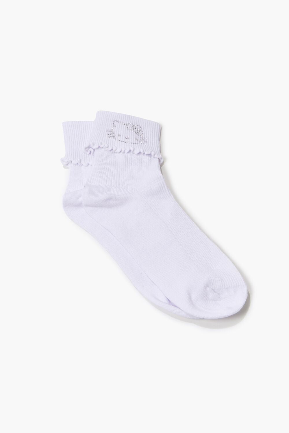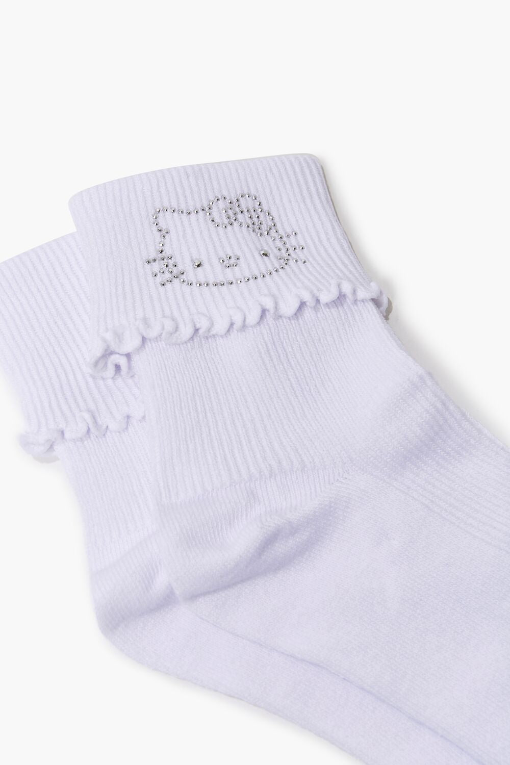 A ribbed knit pair of crew socks featuring a rhinestone Hello Kitty graphic and lettuce-edge trim.