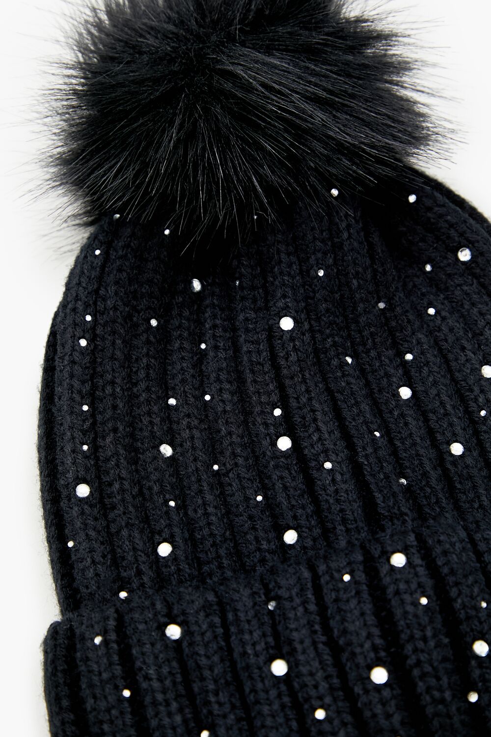 A ribbed knit beanie featuring allover rhinestone embellishments. a pom pom embellishment. and foldover brim.