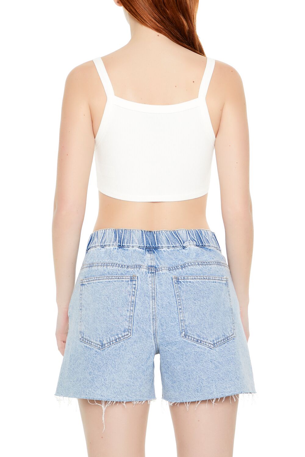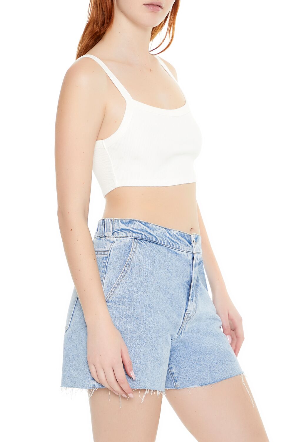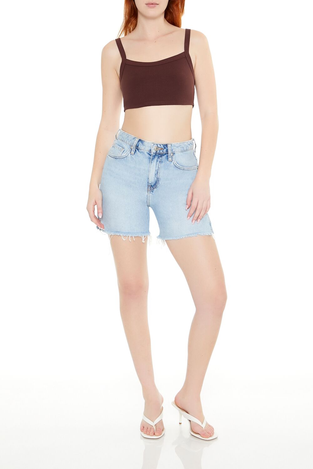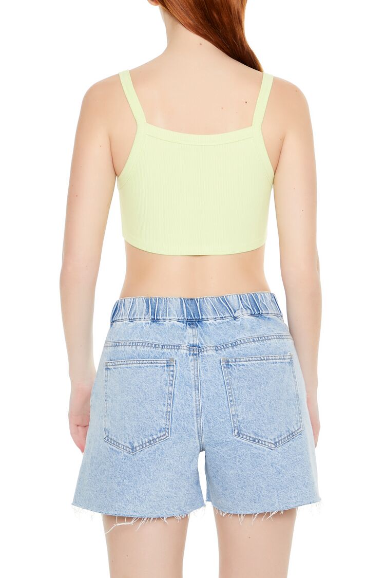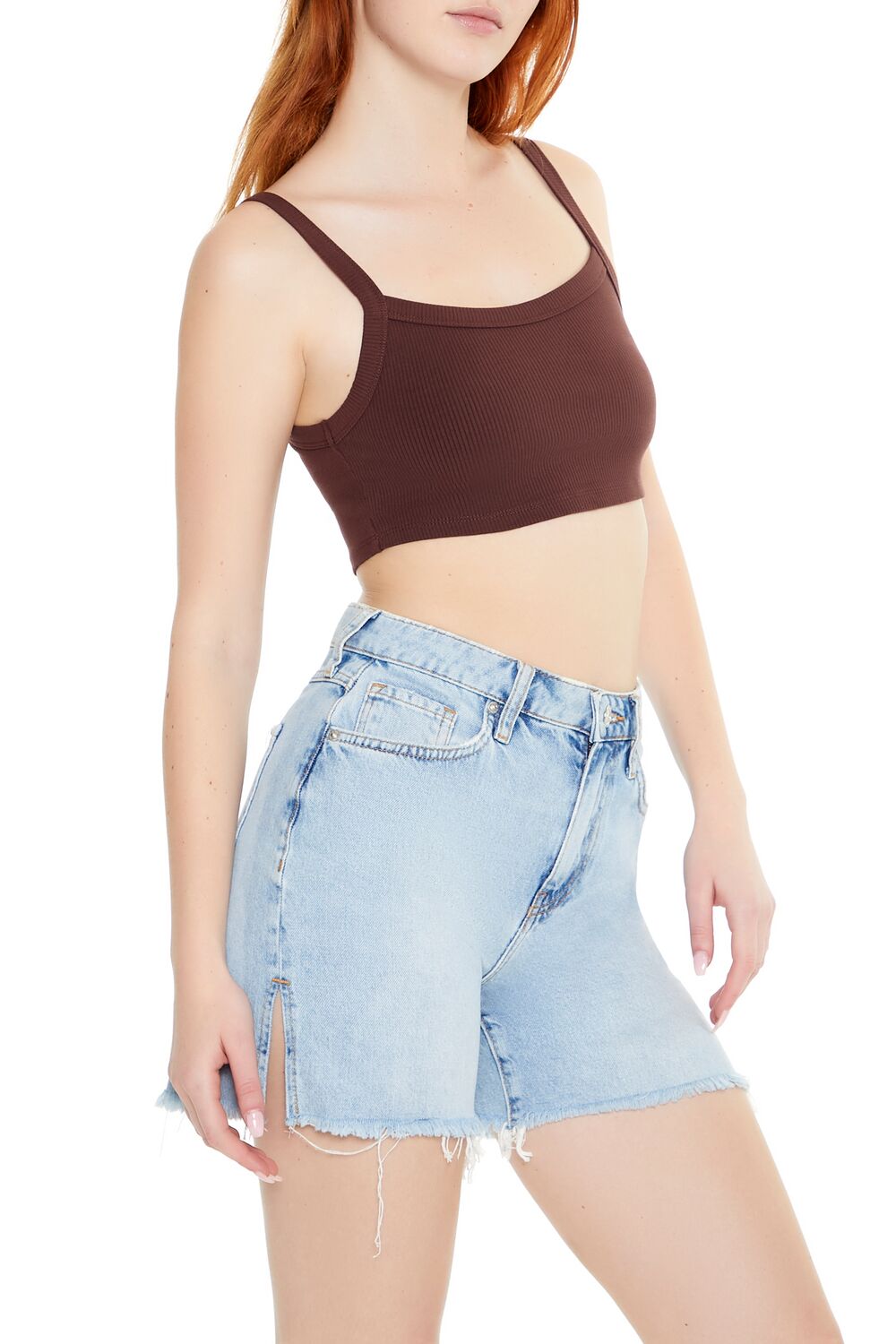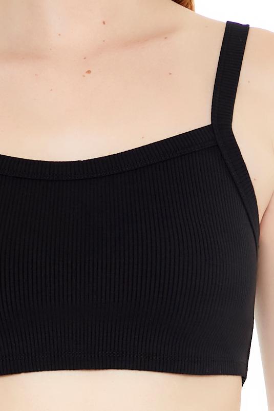 A ribbed knit cami featuring a straight-cut neckline and back. fixed straps. and a cropped hem.
