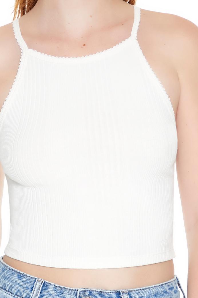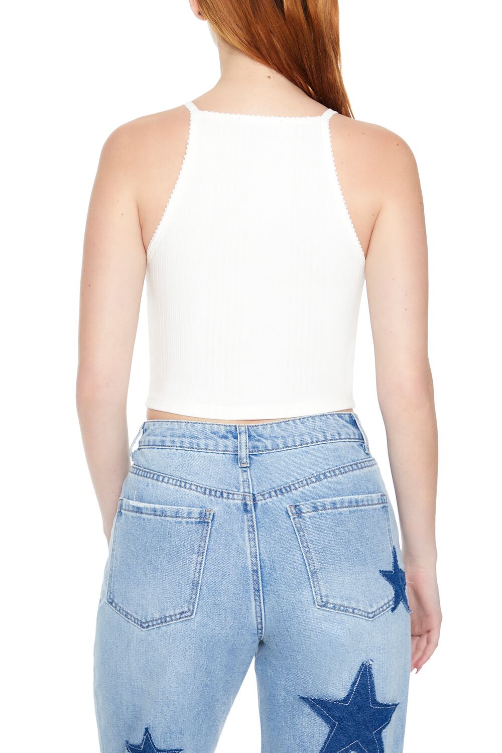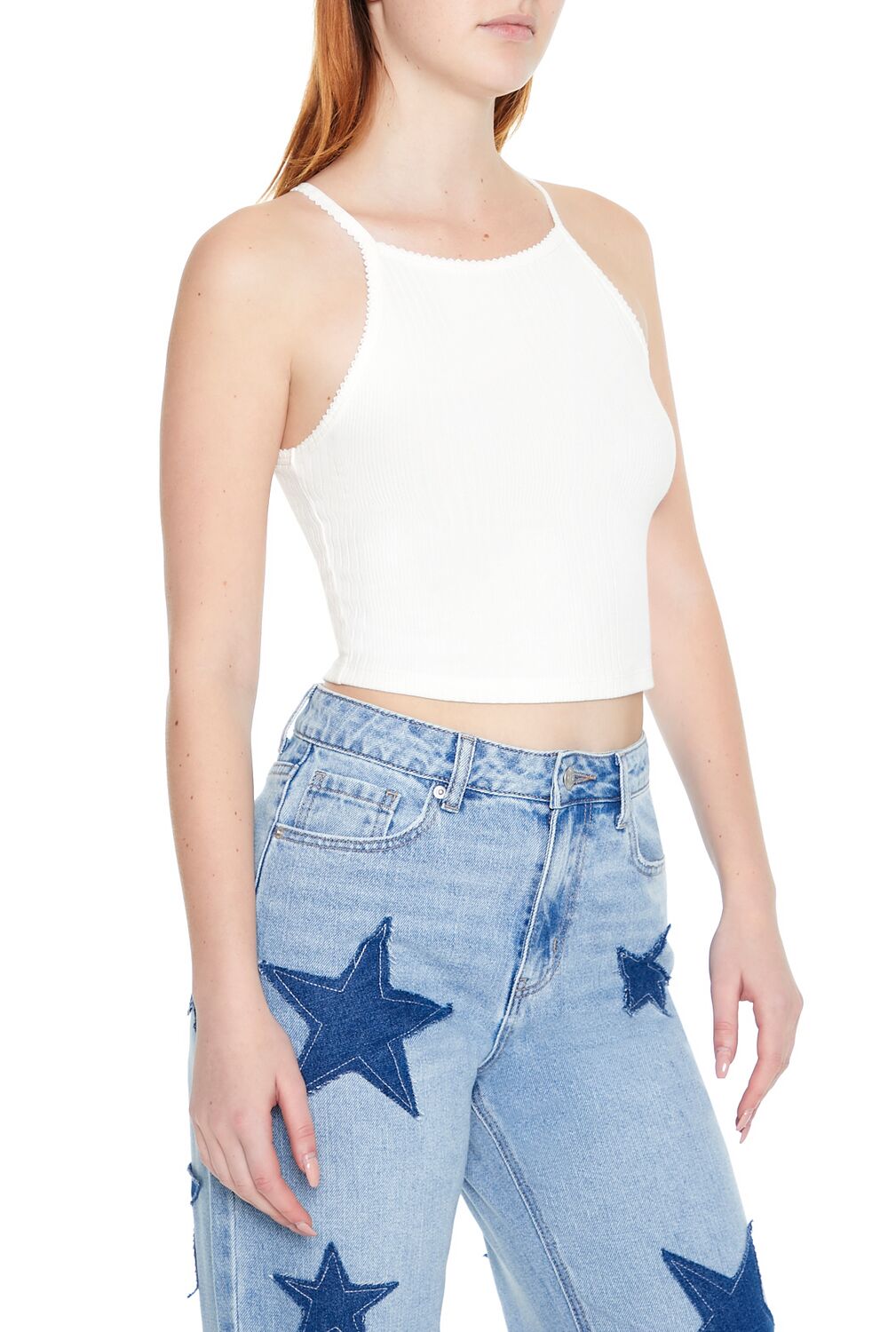 A knit cami featuring a straight-cut neckline. scalloped trim. ribbed construction. fixed straps. and a cropped hem.