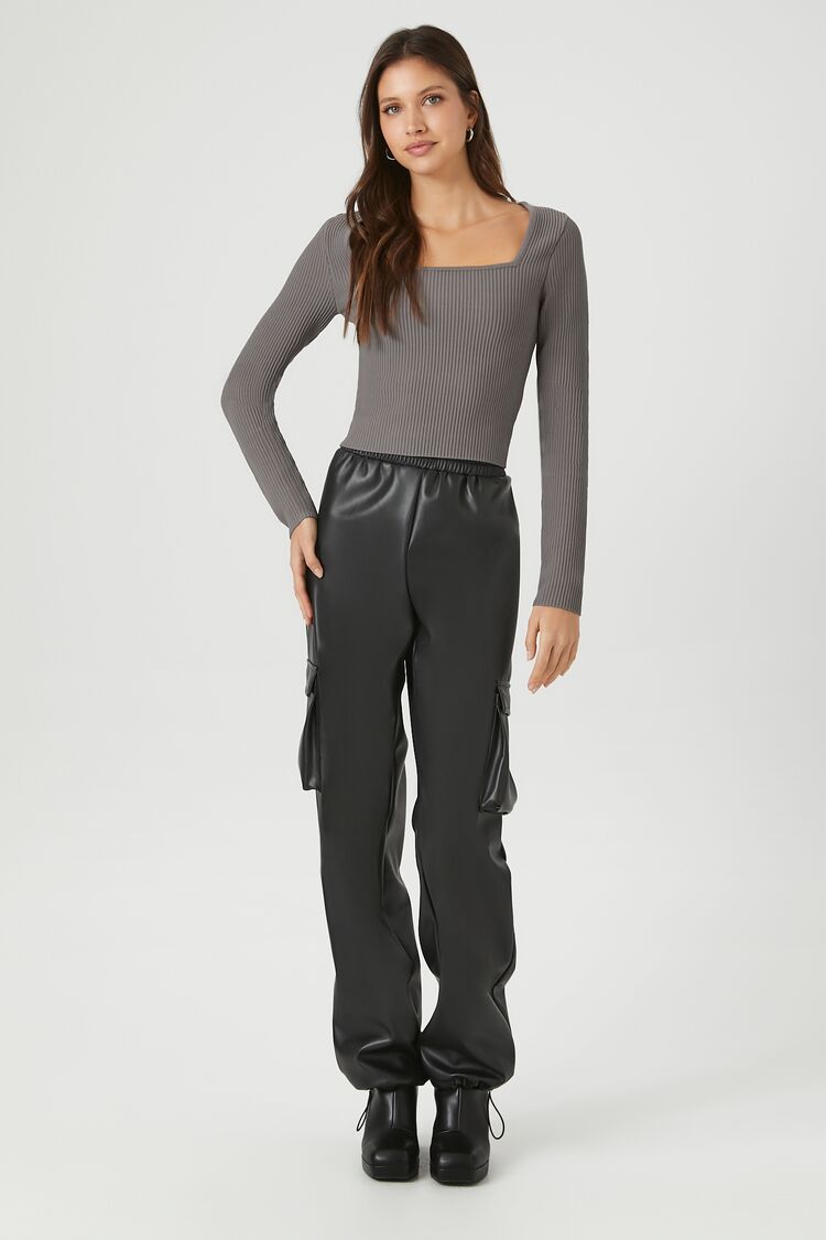 A ribbed knit sweater featuring a square neckline. long sleeves. and a fitted silhouette.