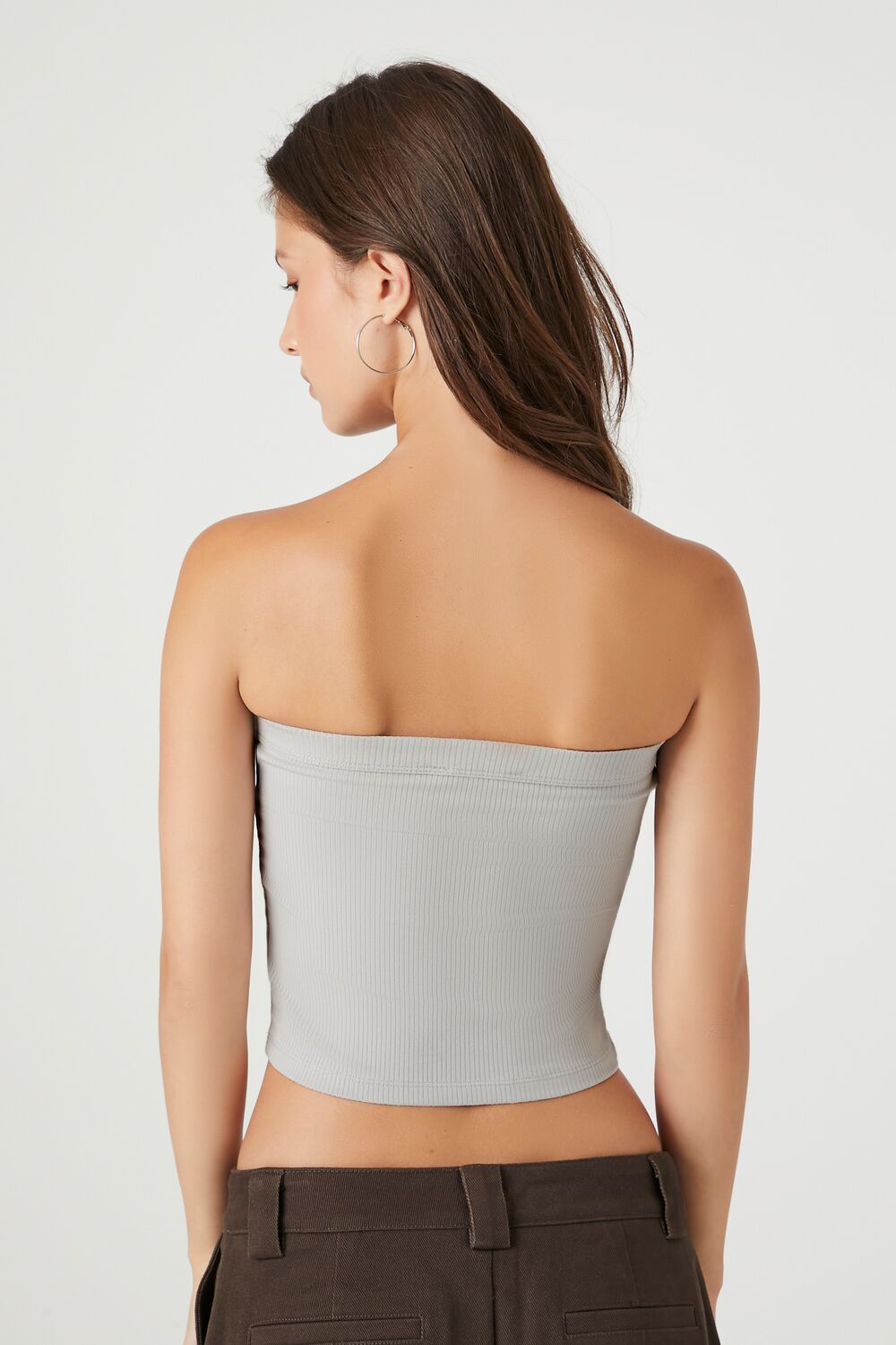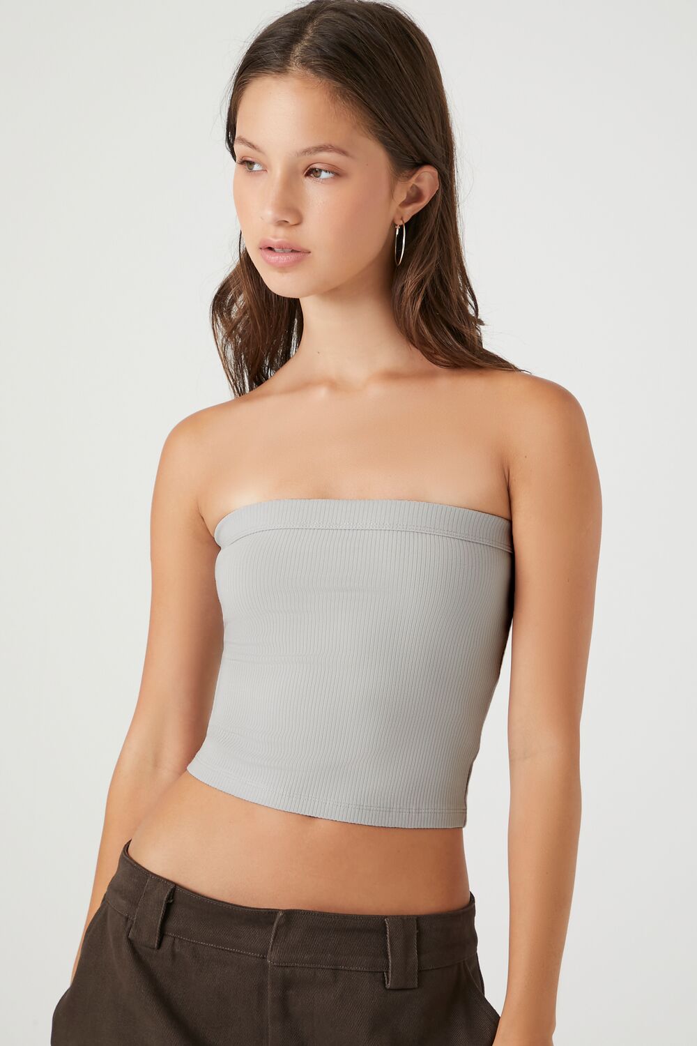 A ribbed knit tube top featuring a straight-cut neckline and semi-cropped hem.