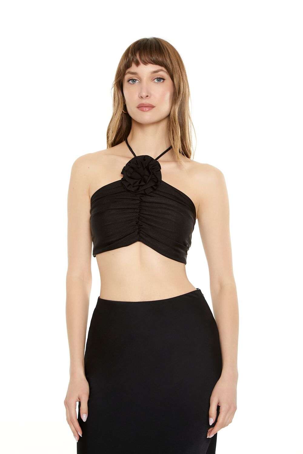 A knit crop top featuring a rosette chest embellishment. self-tie halter neckline. open back. and a front ruched construction.