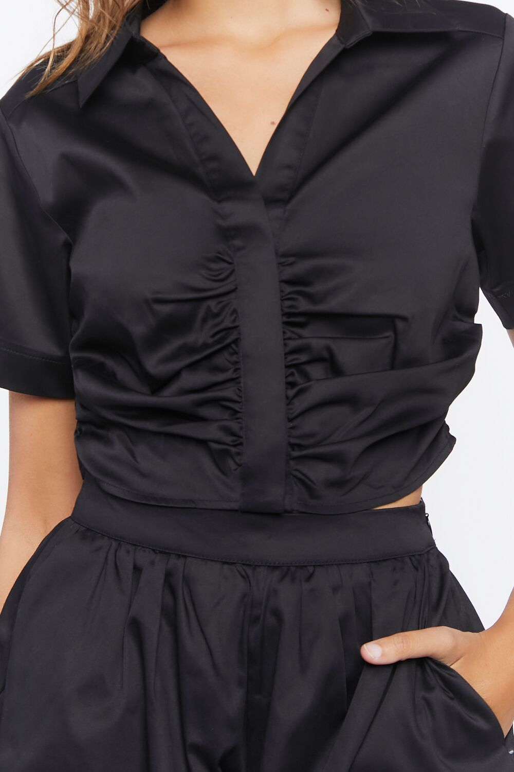A woven top featuring a basic collar. ruched front construction. split neckline. short sleeves. and a cropped hem.