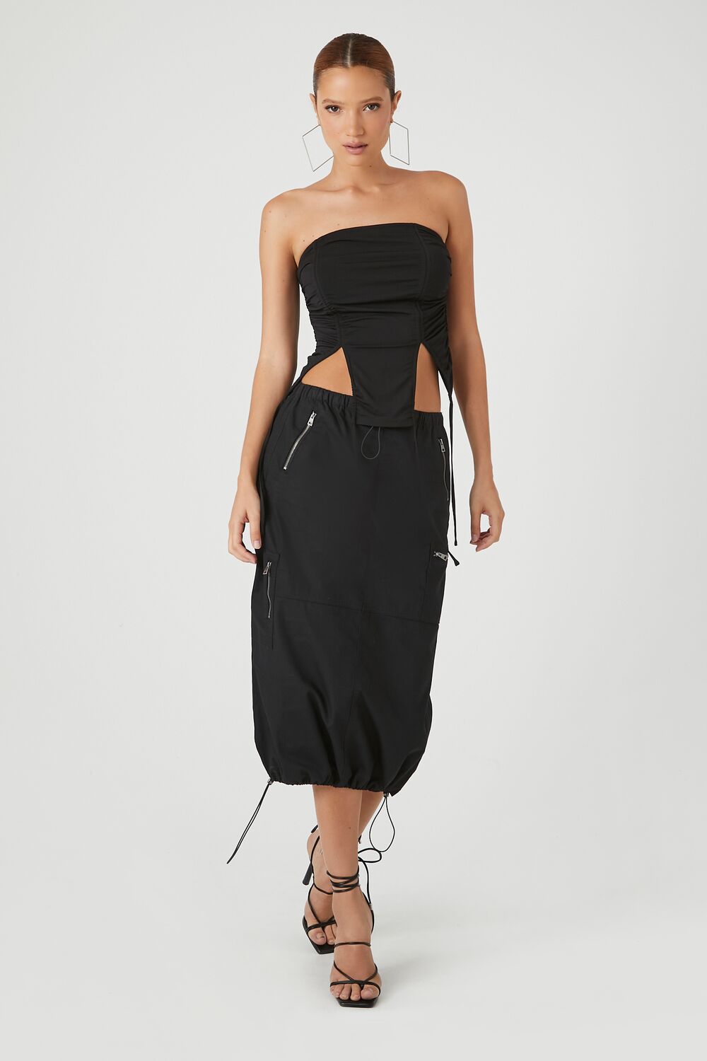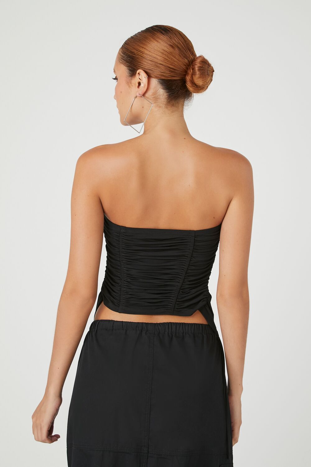 A ribbed knit tube top featuring a straight-cut neckline and back. ruched drawstring trim. and slits at the hem.