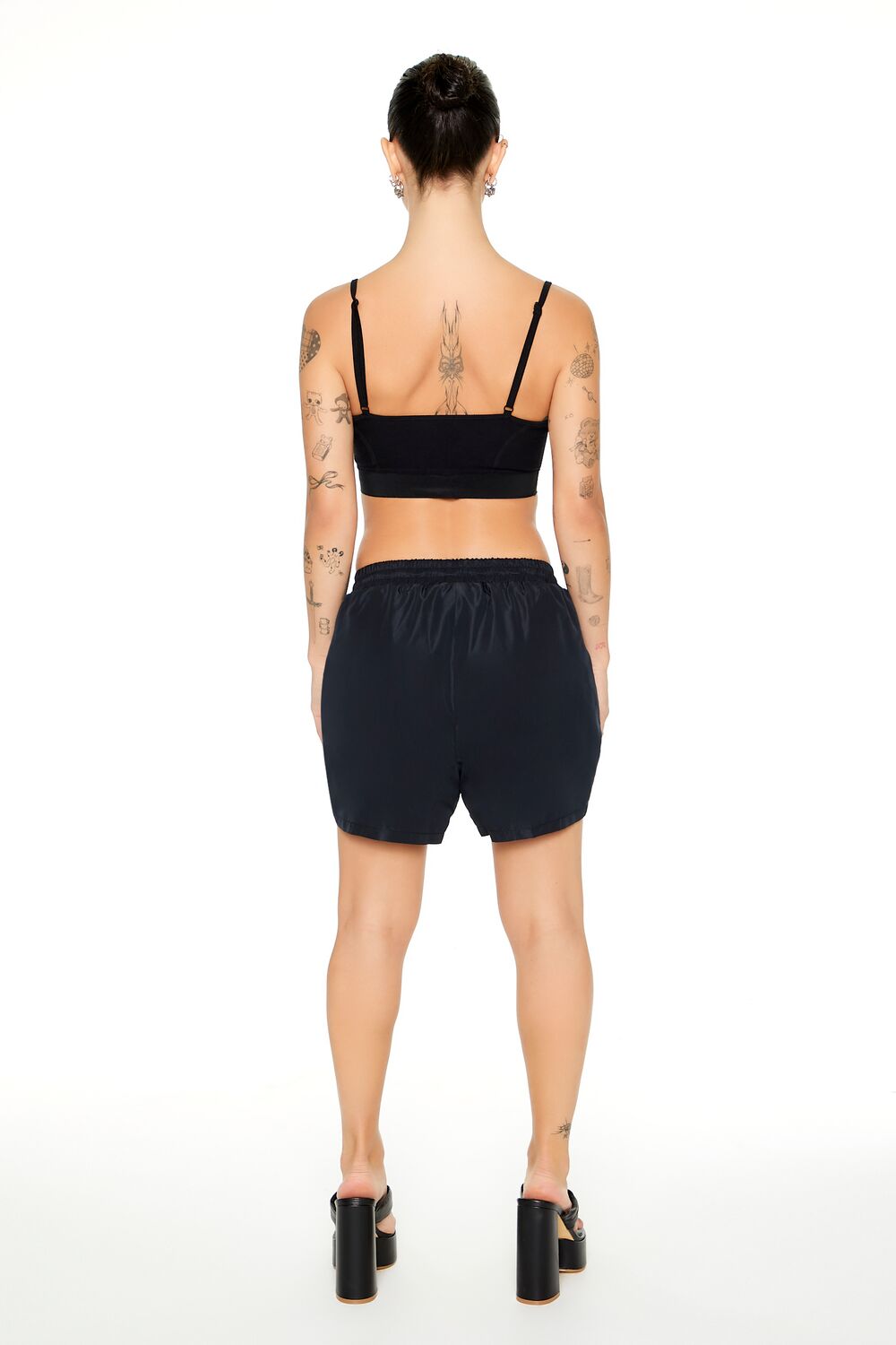 A pair of woven shorts featuring a ruched design and toggle drawstring trim.
