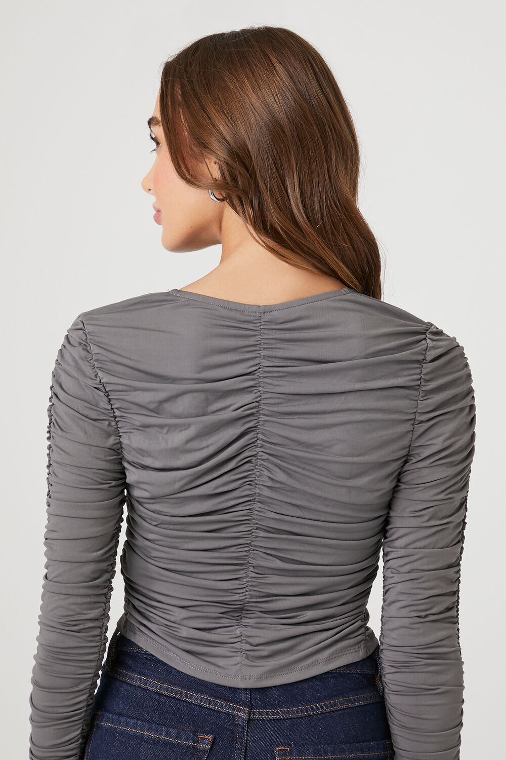 A knit crop top featuring a V-neckline. allover ruched construction. long sleeves. and a notched hem.