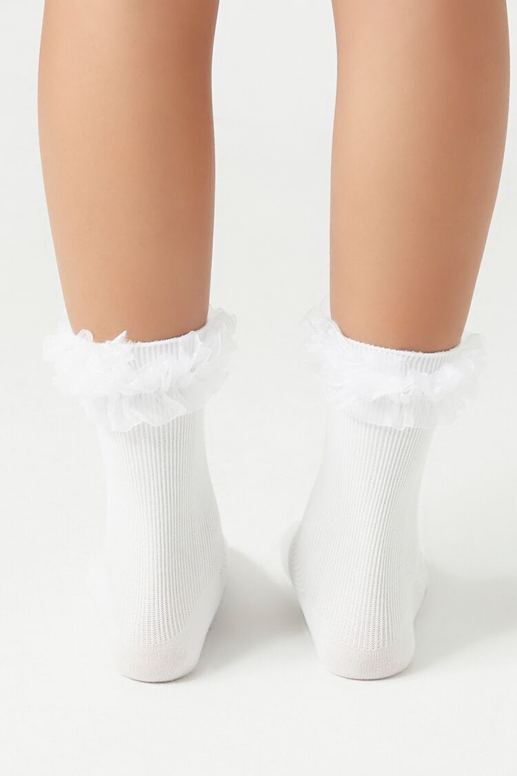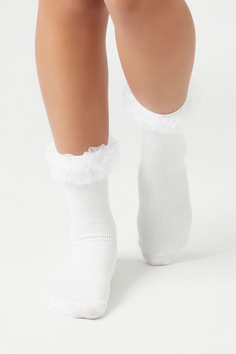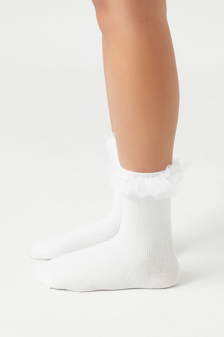 A pair of ribbed knit crew socks featuring ruffle trim.