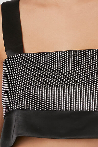 A satin tank top featuring a square-cut neckline and back. shoulder straps. rhinestone embellishments. and cropped hem.