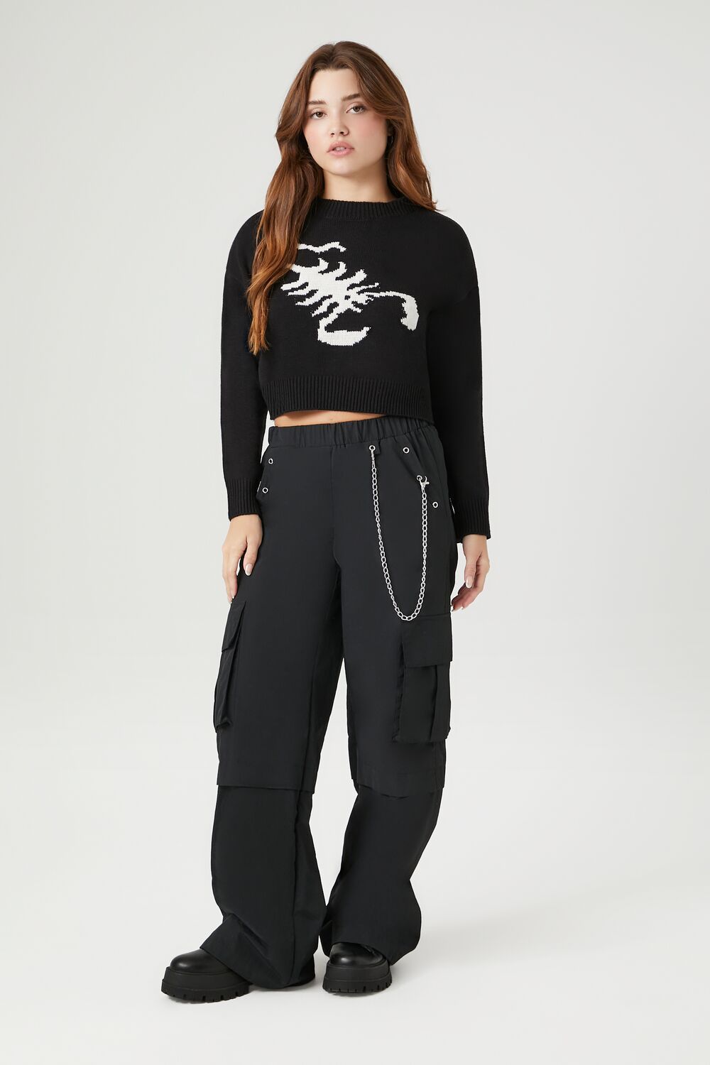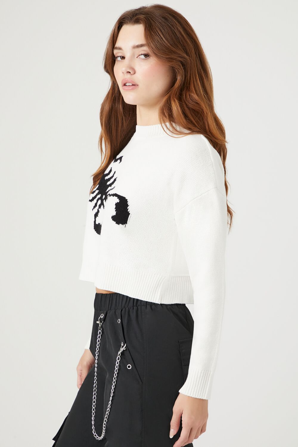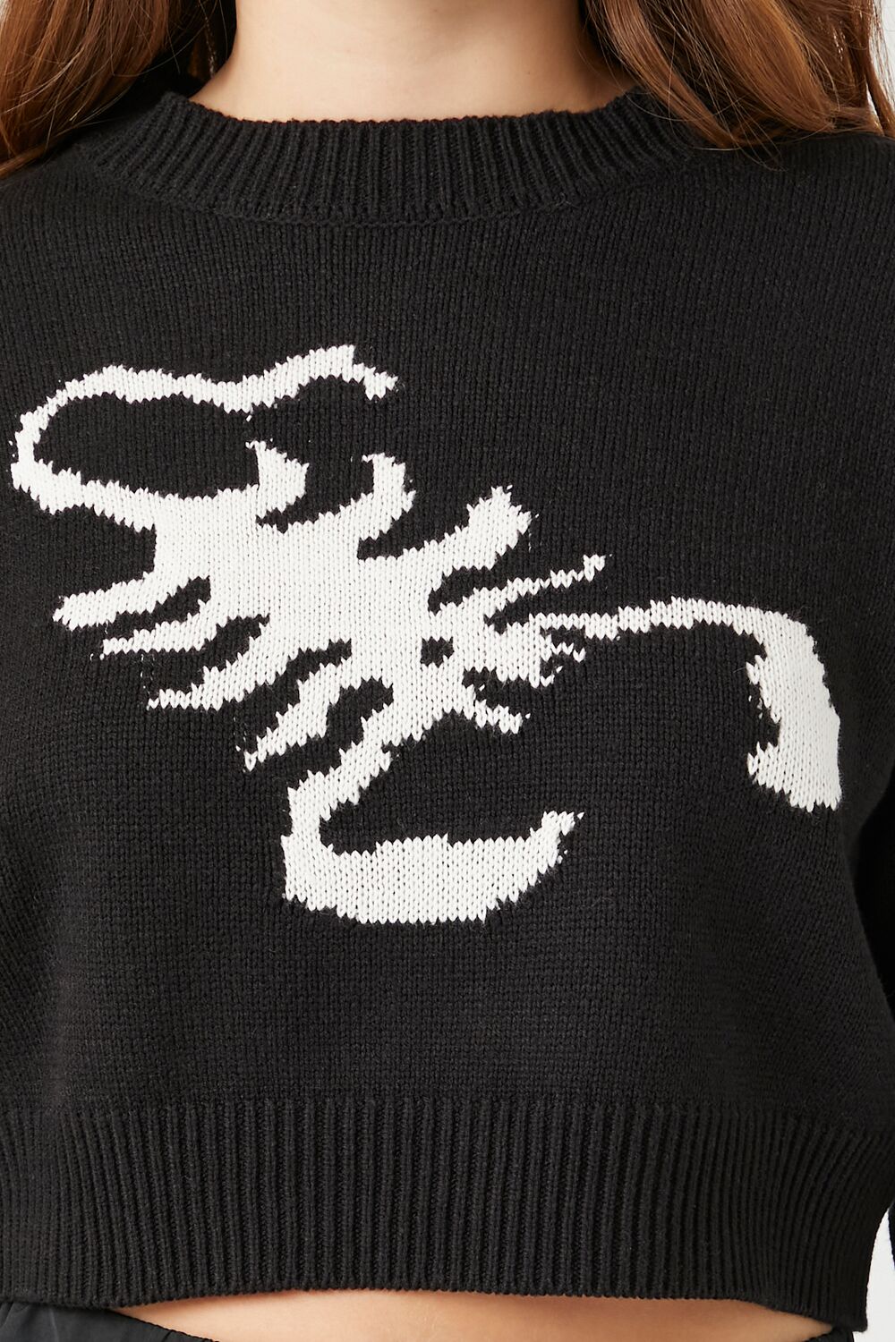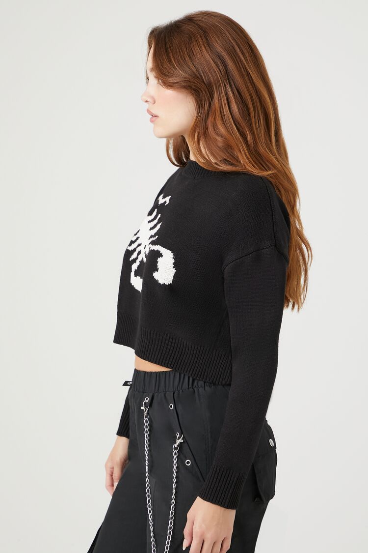 A knit sweater featuring a scorpion graphic. long sleeves. ribbed trim. a round neckline. and cropped hem.
