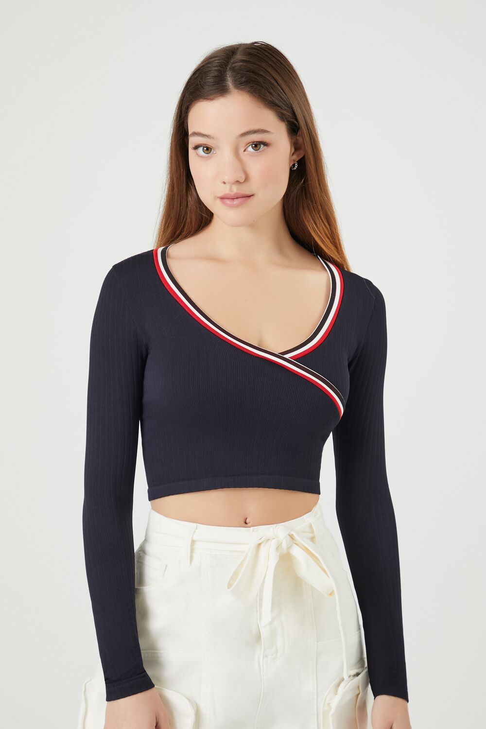 A seamless knit crop top featuring a surplice neckline. striped trim. and long sleeves.