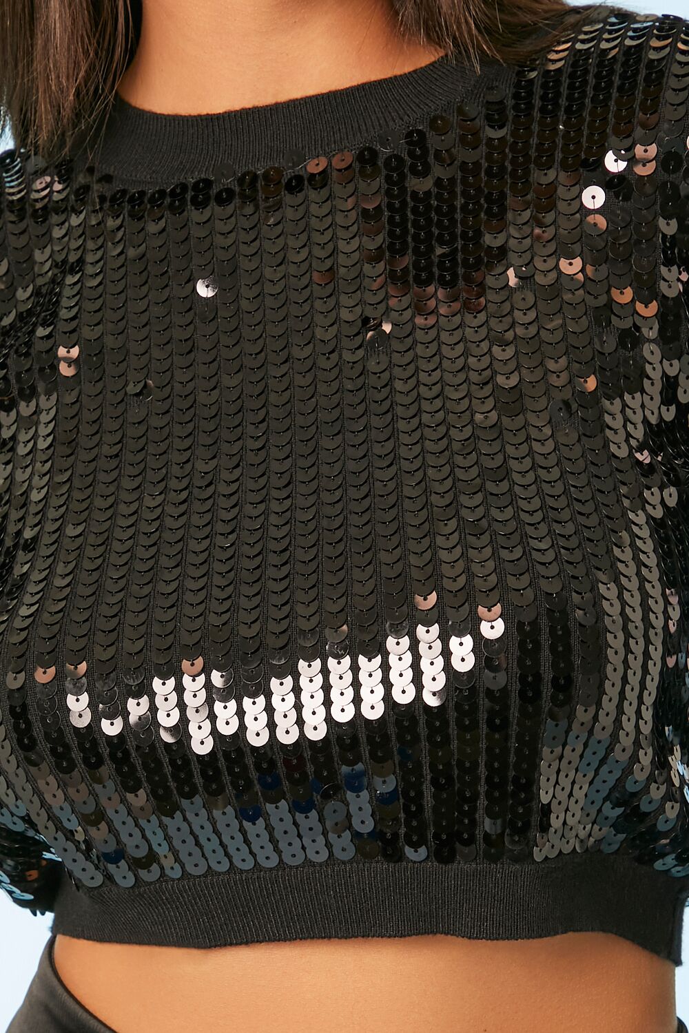A knit sweater featuring allover sequin embellishments. a crew neck. long sleeves. ribbed trim. and cropped hem.