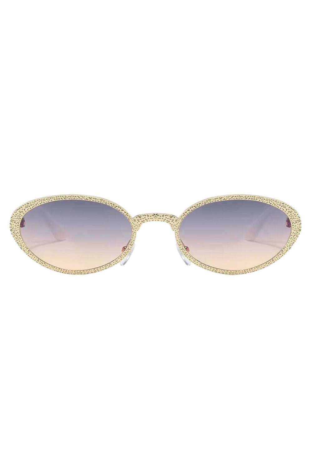 With soft gradient lenses that shift from purple to pink like a sunset. Seraphina channels old-Hollywood elegance with a modern twist. The dimpled golden frame catches the light just right. while the delicate white arms add a soft finish. A dreamy pick for garden weddings. bachelorette weekends. or golden hour photos. Glamorous. graceful. and guaranteed to turn heads.
