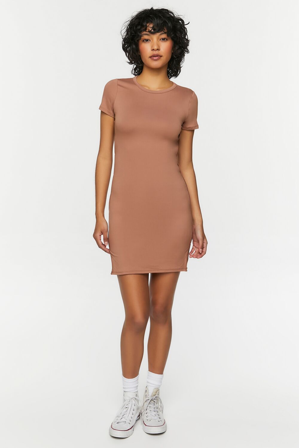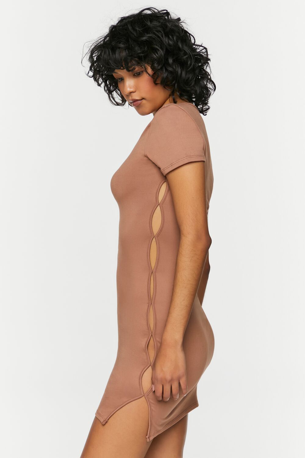 A knit mini dress featuring a round neckline. short sleeves. side cutouts. and bodycon silhouette.