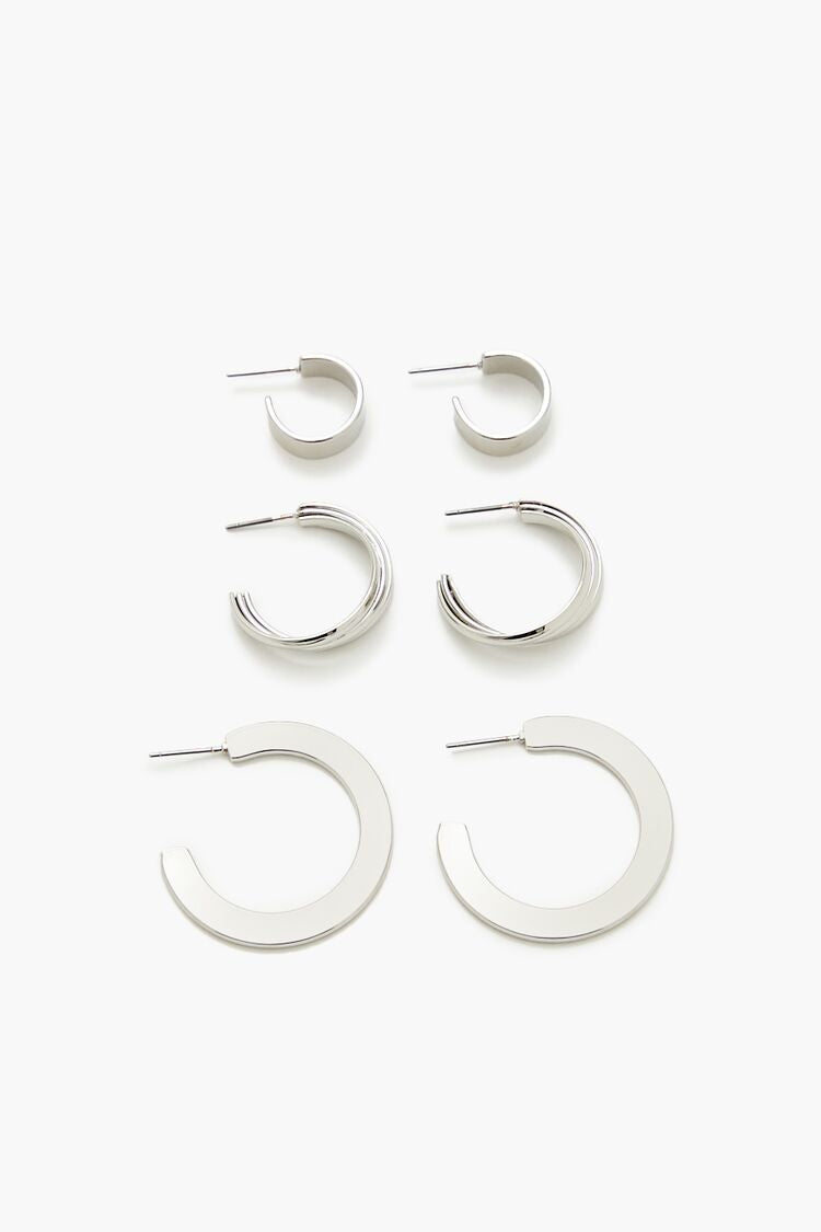 A set of high-polish hoop earrings featuring thick and multi-hoop designs. a smooth finish. open-ended construction. and post-back closures.