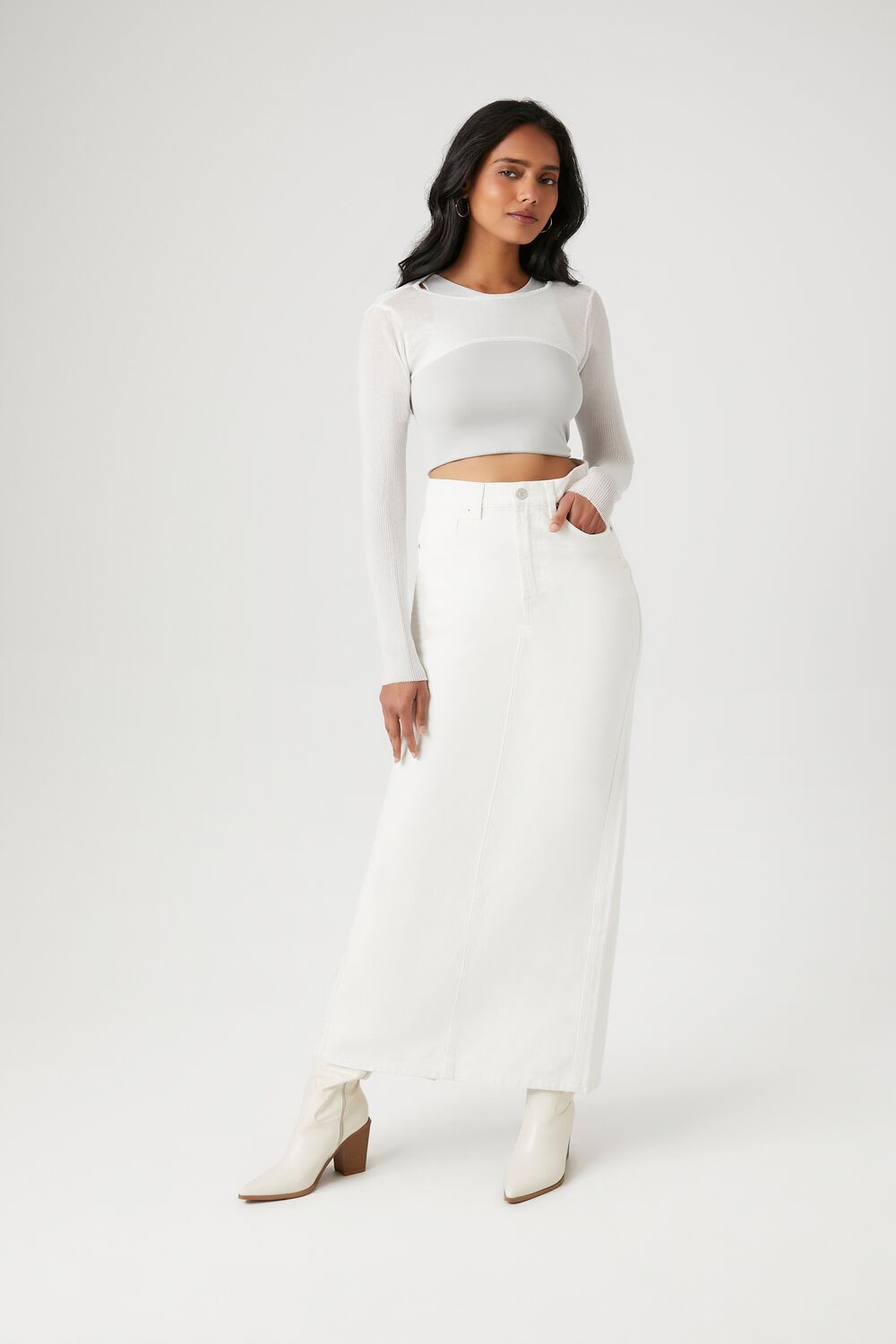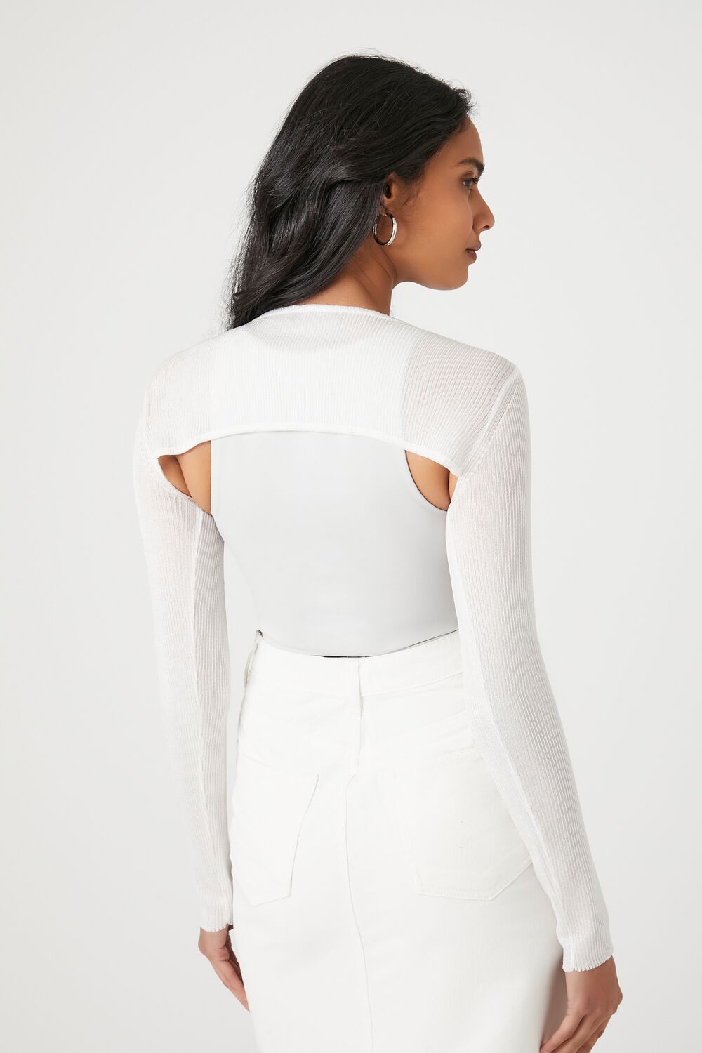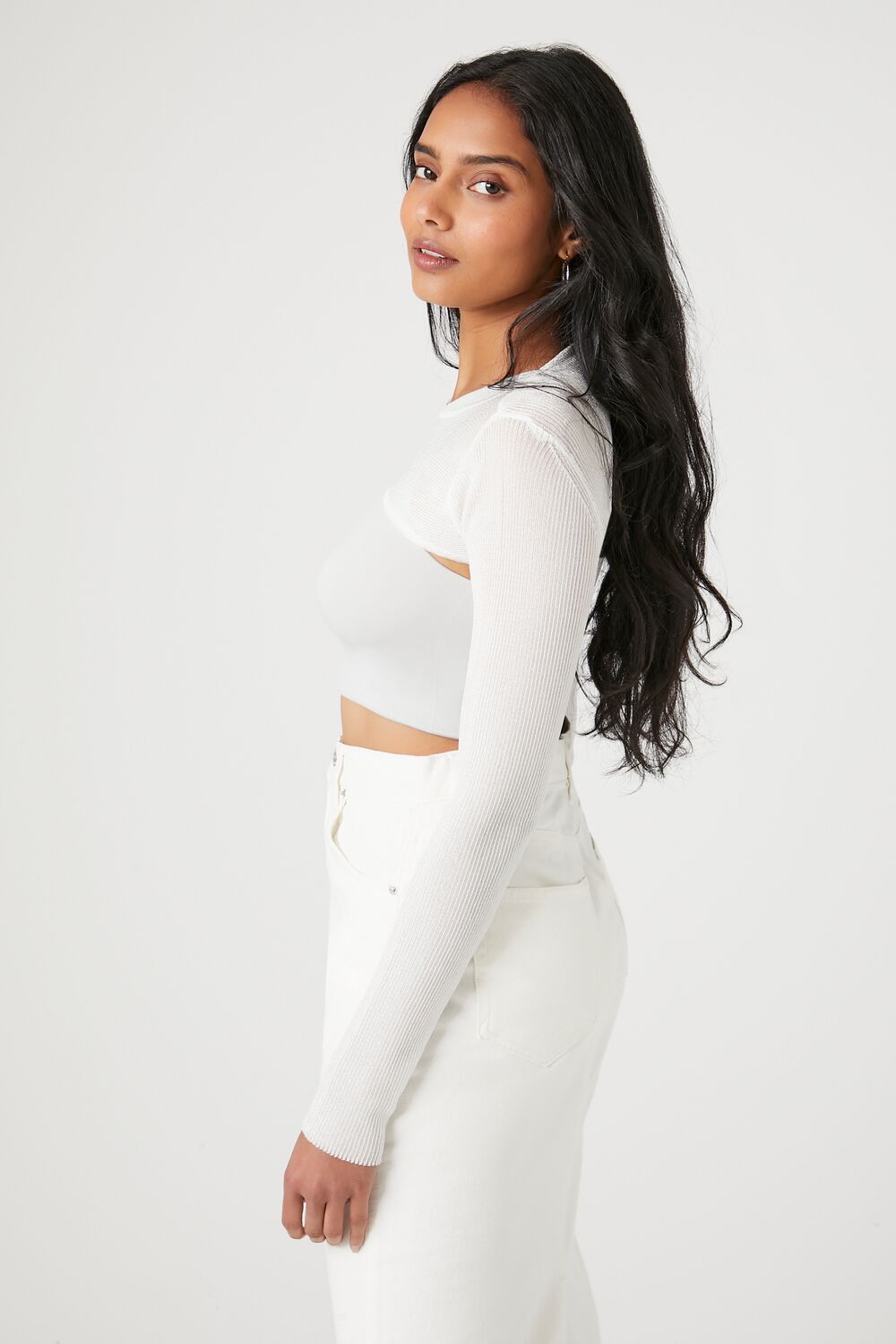 A sheer sweater-knit top featuring a round neckline. long sleeves. and a super cropped hem.