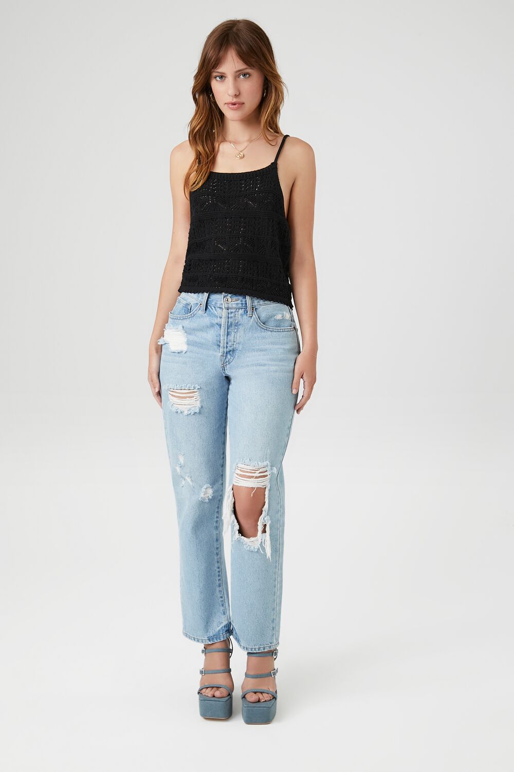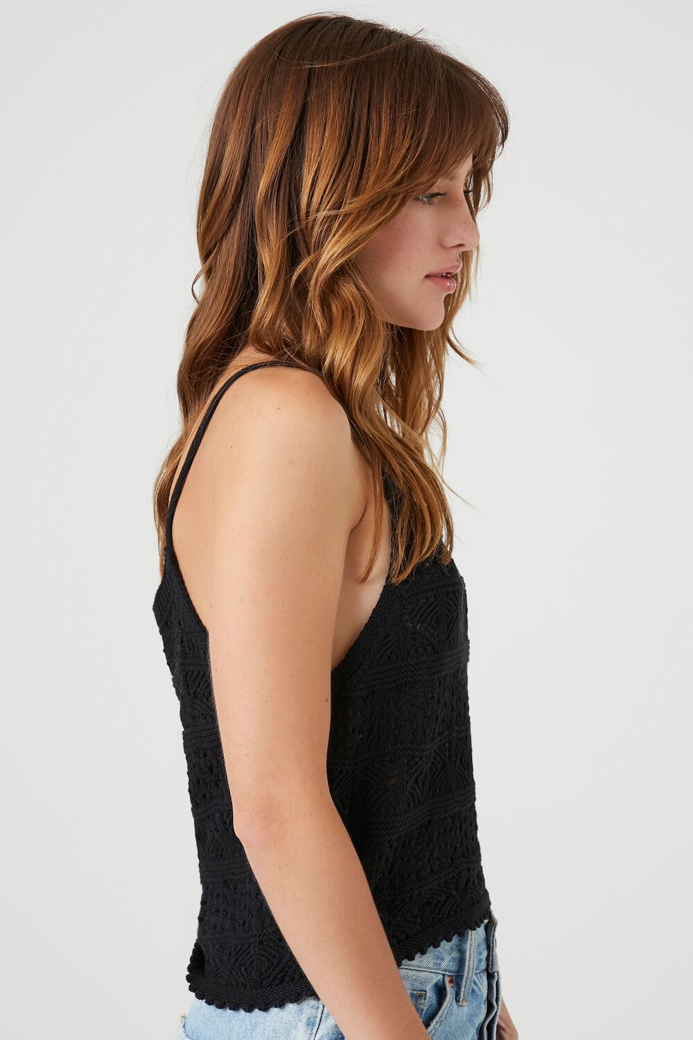 A sweater-knit cami featuring a straight-cut neck and back. fixed straps. picot trim. and an open knit design.
