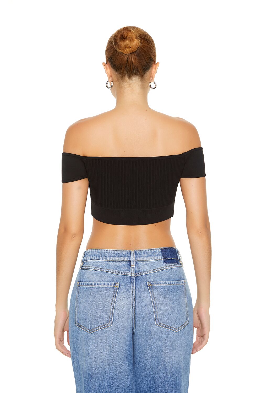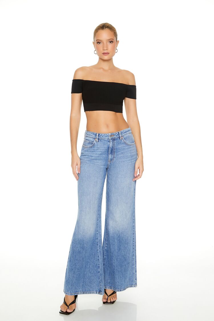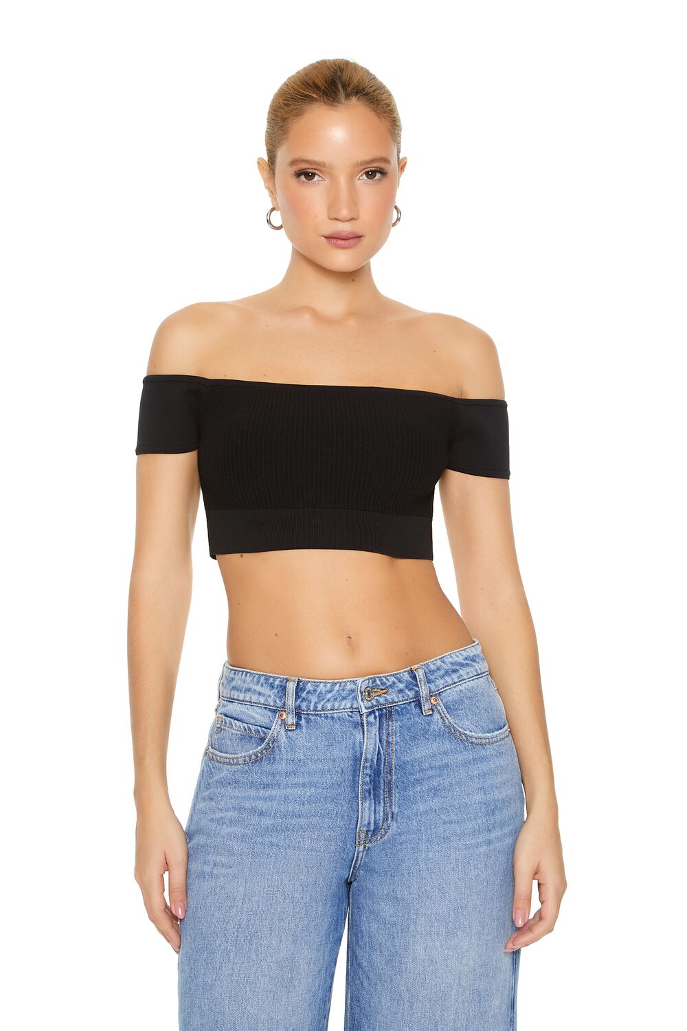 A sweater-knit crop top featuring an off-the-shoulder neckline and short sleeves.