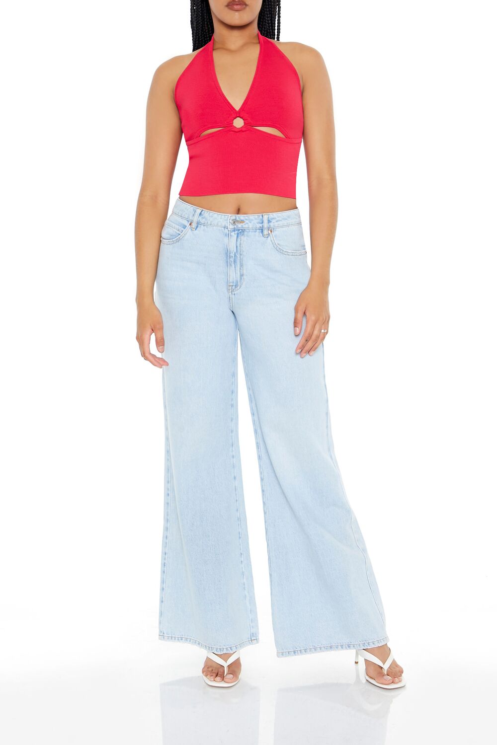 A sweater-knit top featuring a halter neckline. front O-ring and cutouts. a cropped hem. and open back.