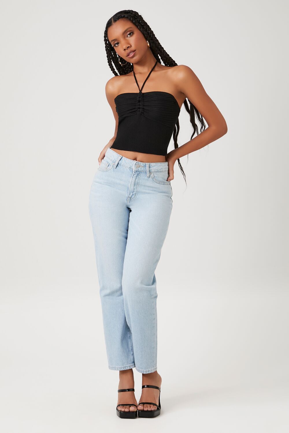 A sweater-knit crop top featuring a halter neckline with self-tie closure. ruched bust. and straight-cut back.