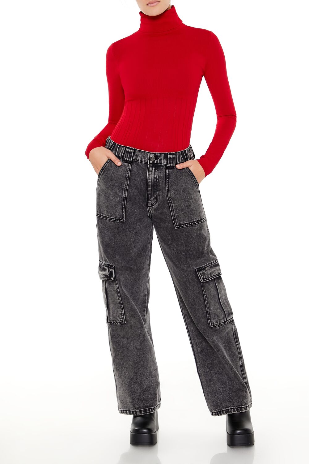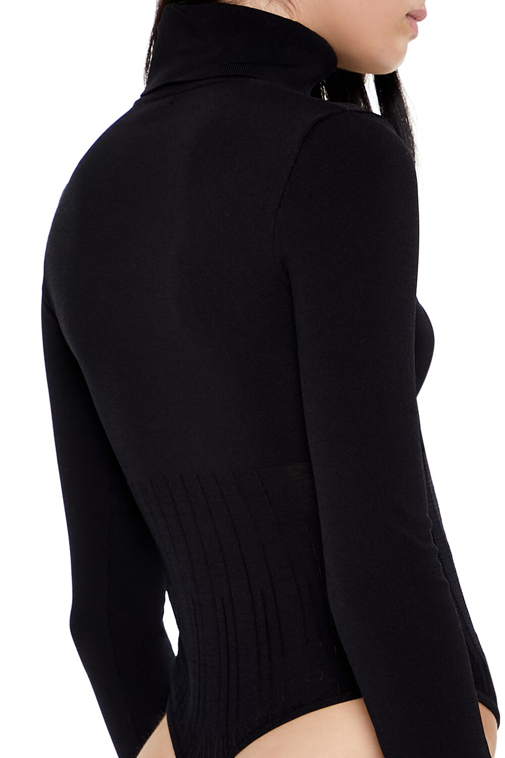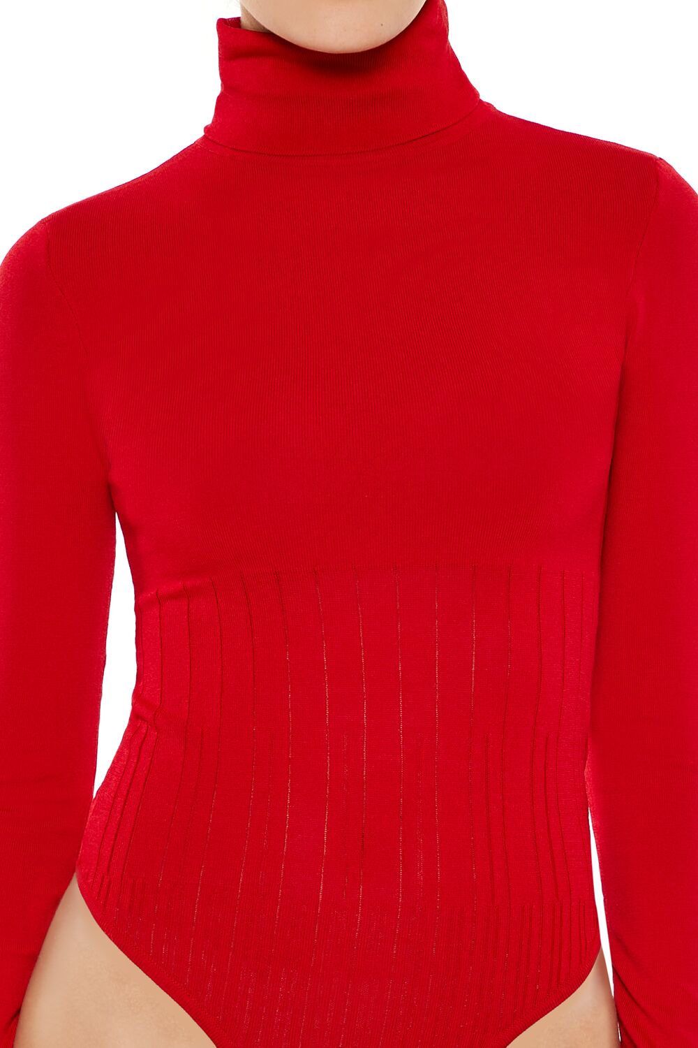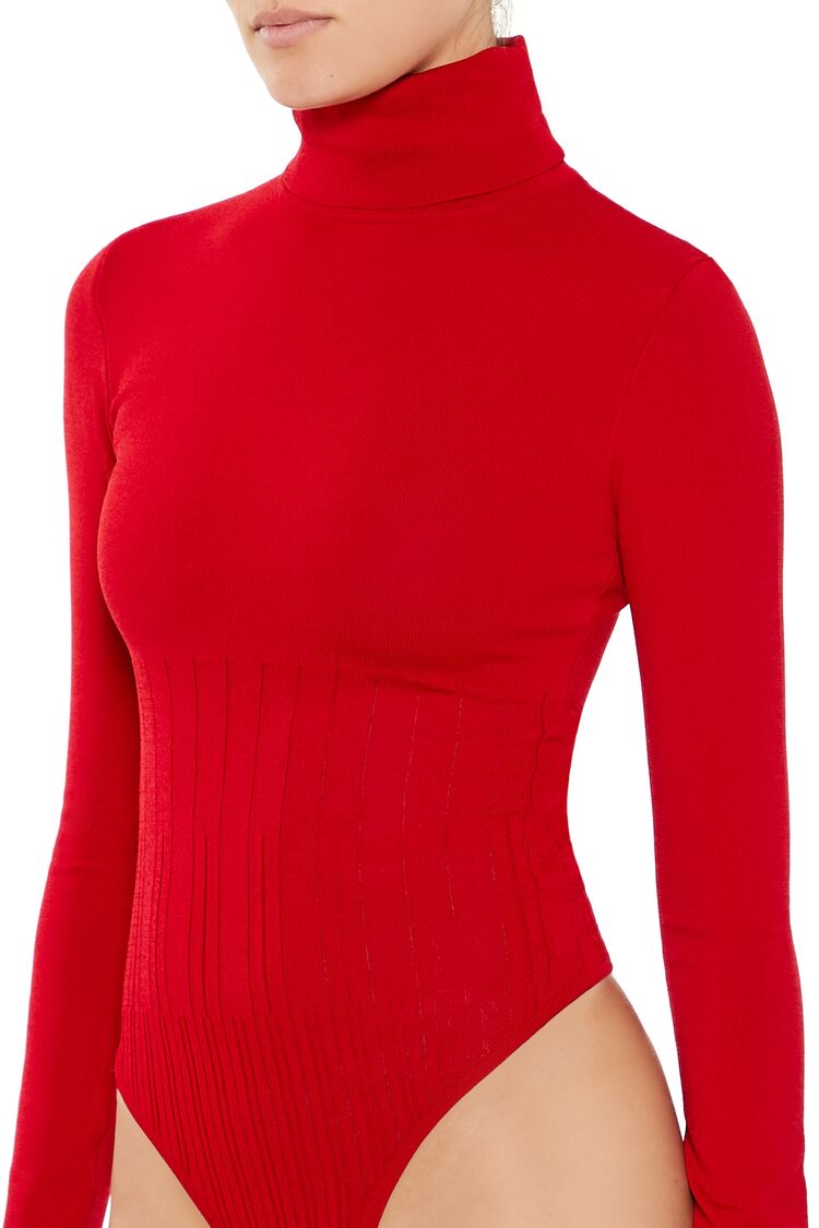 A sweater-knit bodysuit featuring a turtleneck. long sleeves. and thong cut.