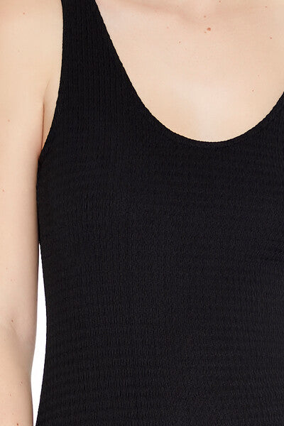 A knit tank dress featuring a V-neckline and back. bodycon silhouette. and midi length.