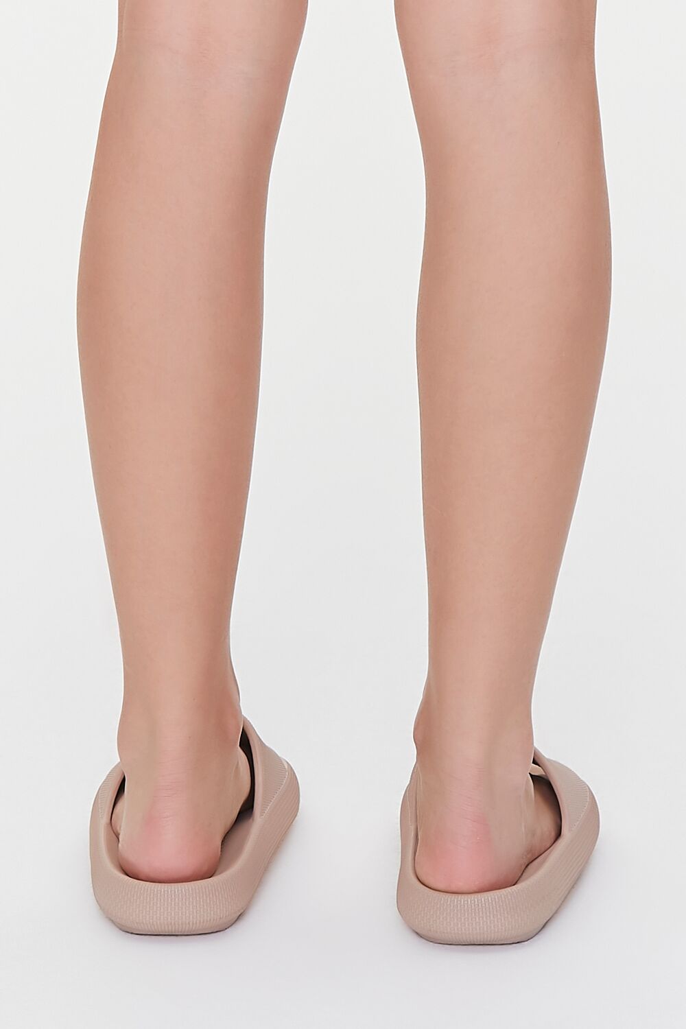 A pair of textured foam slides featuring an open almond toe. wide strap. and slip-on styling.