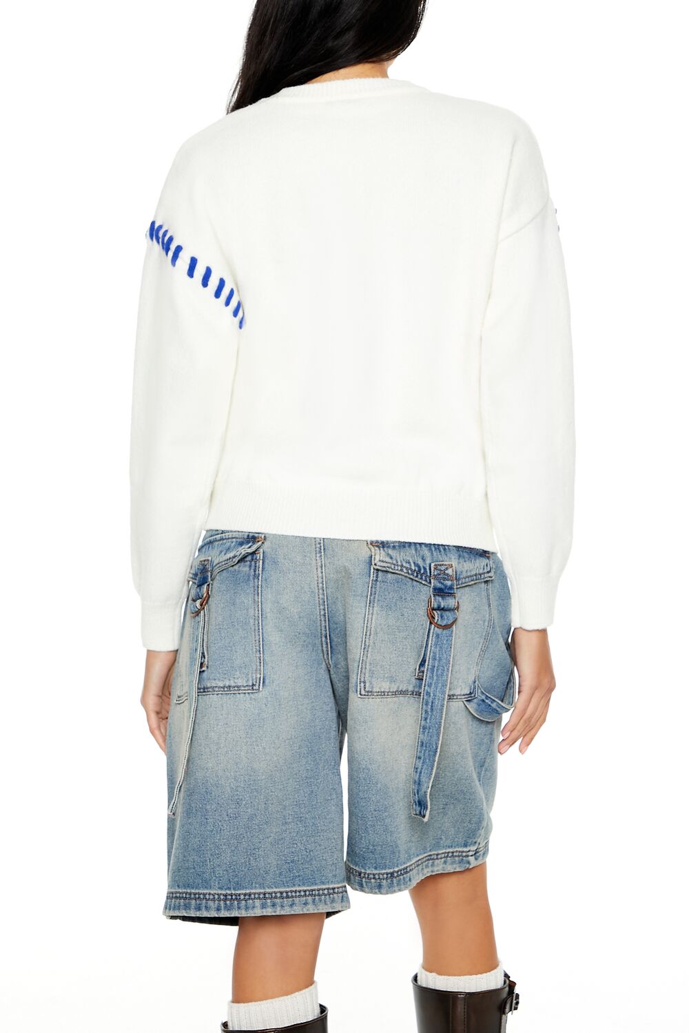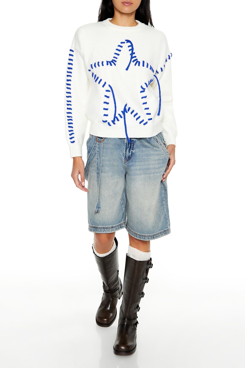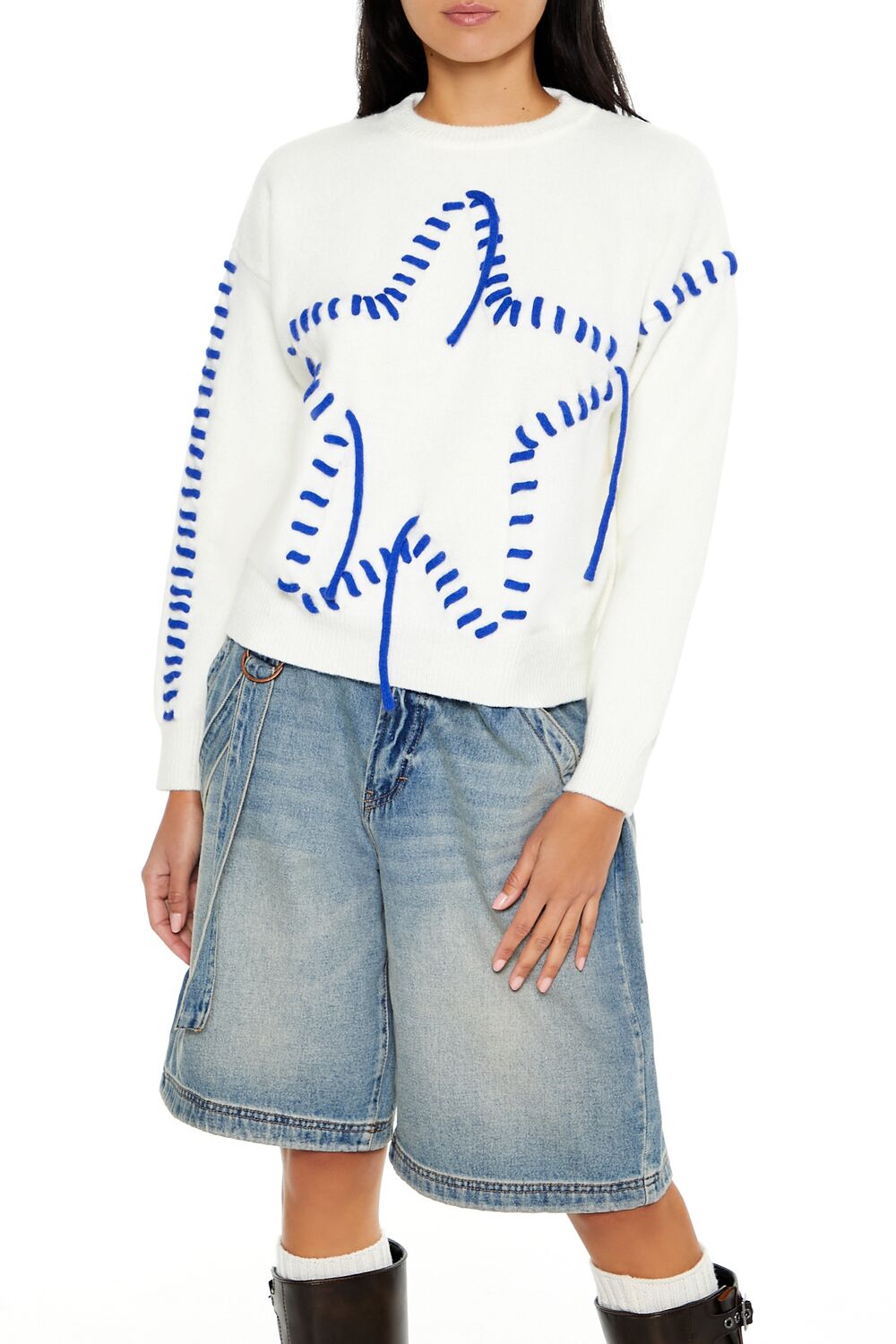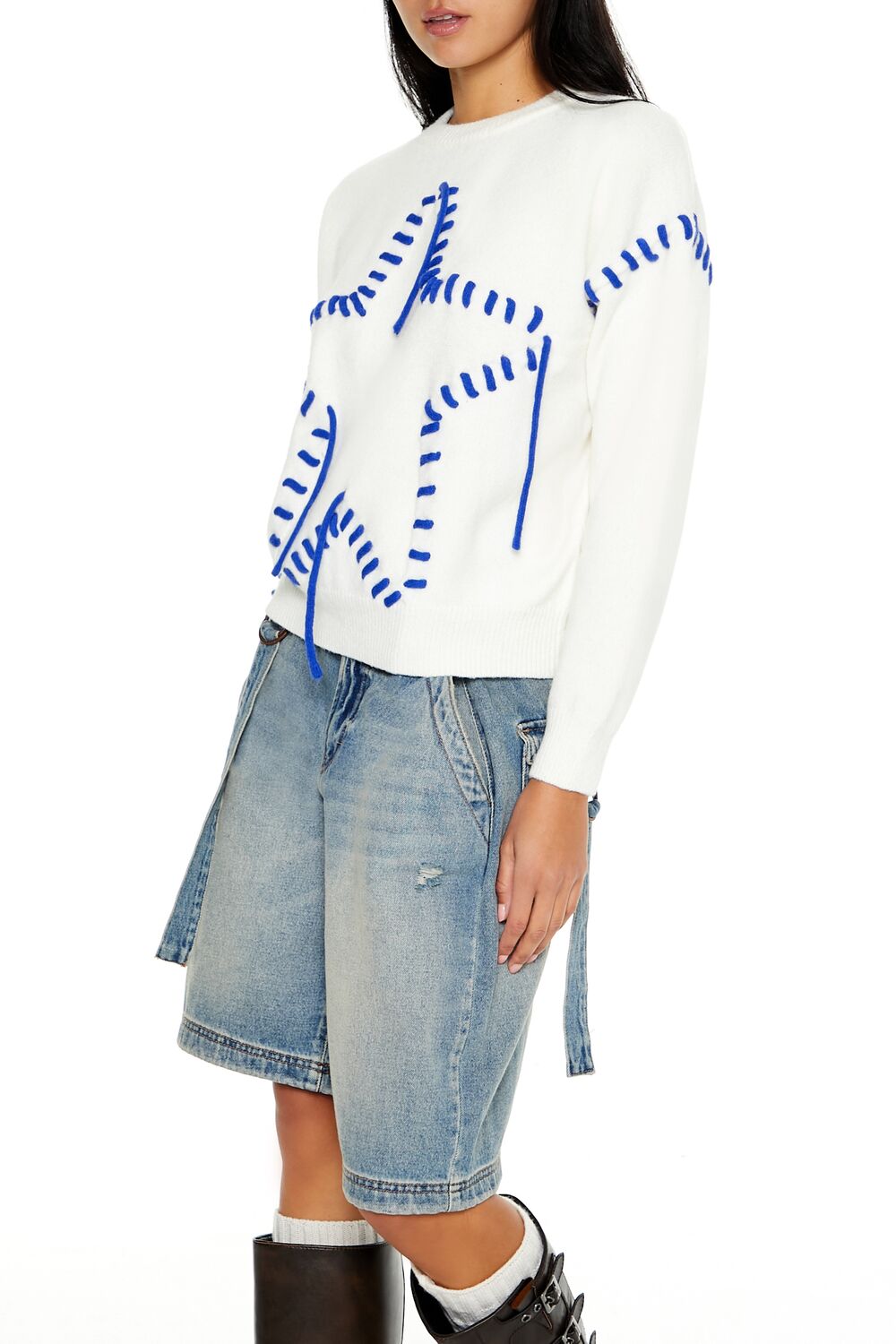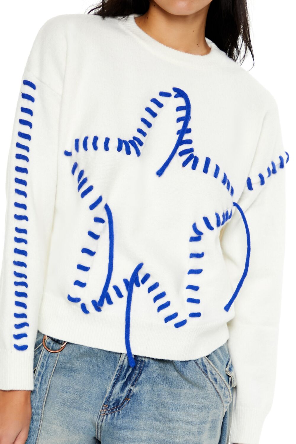 A knit sweater featuring contrasting whipstitched trim and star design. dropped long sleeves. and a round neckline.