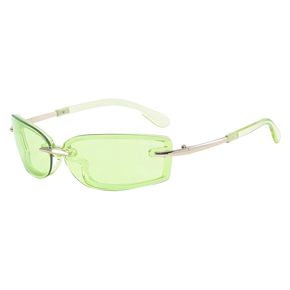 Zuri sunglasses will give your look a futuristic upgrade with its rimless wraparound design and striking cutout details. A unique structural frame extends seamlessly into sculpted nose pads. featuring an open-cut shape for a bold. modern look. Slim gold metal temples add a sleek contrast. making these unisex shades a true statement piece.