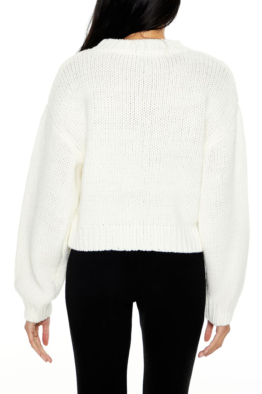 A knit sweater featuring front ‘Bonjour’ text. dropped long sleeves. ribbed trim. and a round neckline.