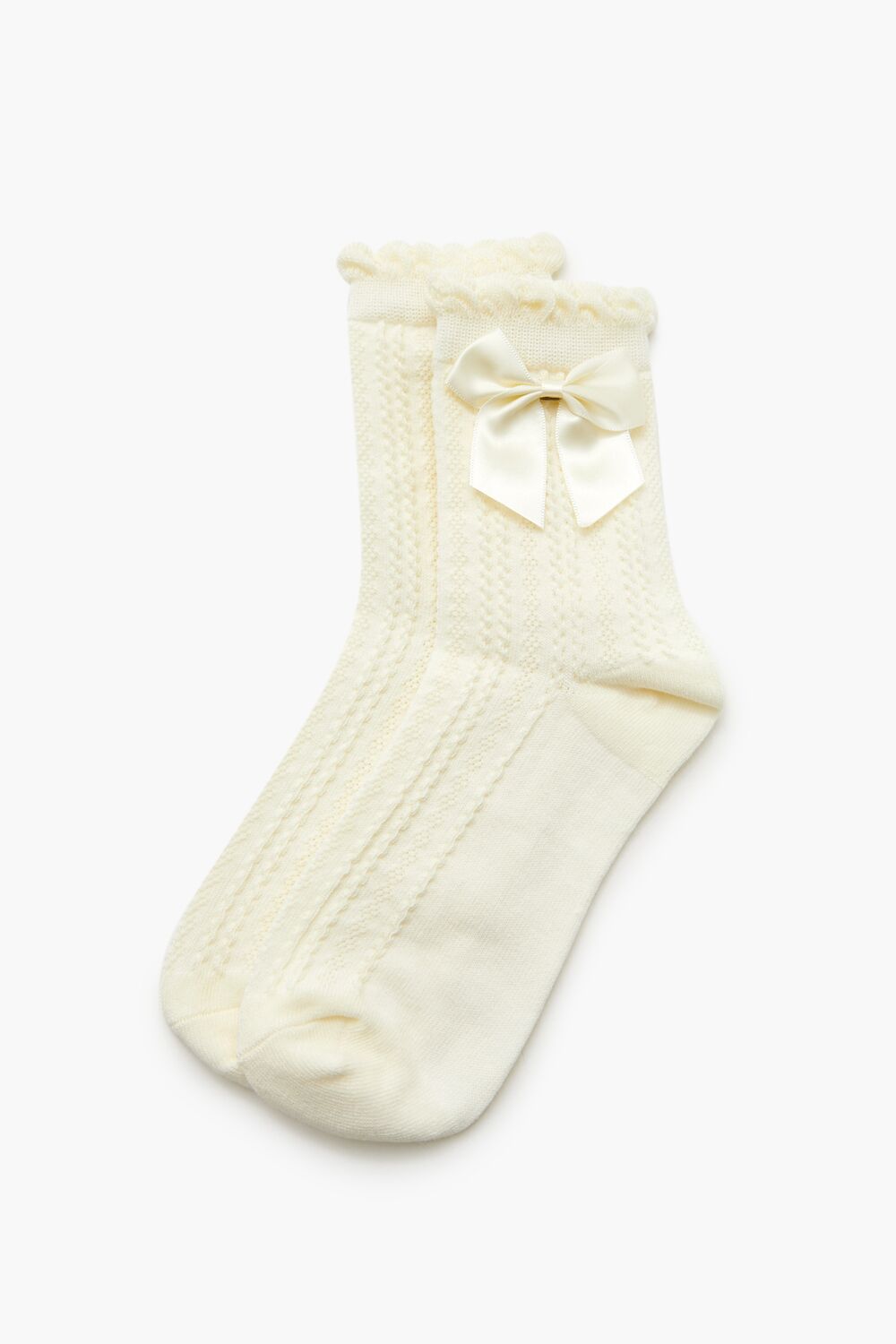 A cable knit pair of crew socks featuring ruffle trim and satin bow embellishments.