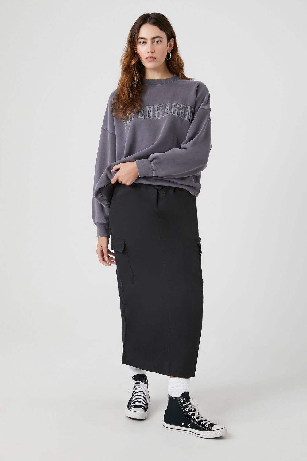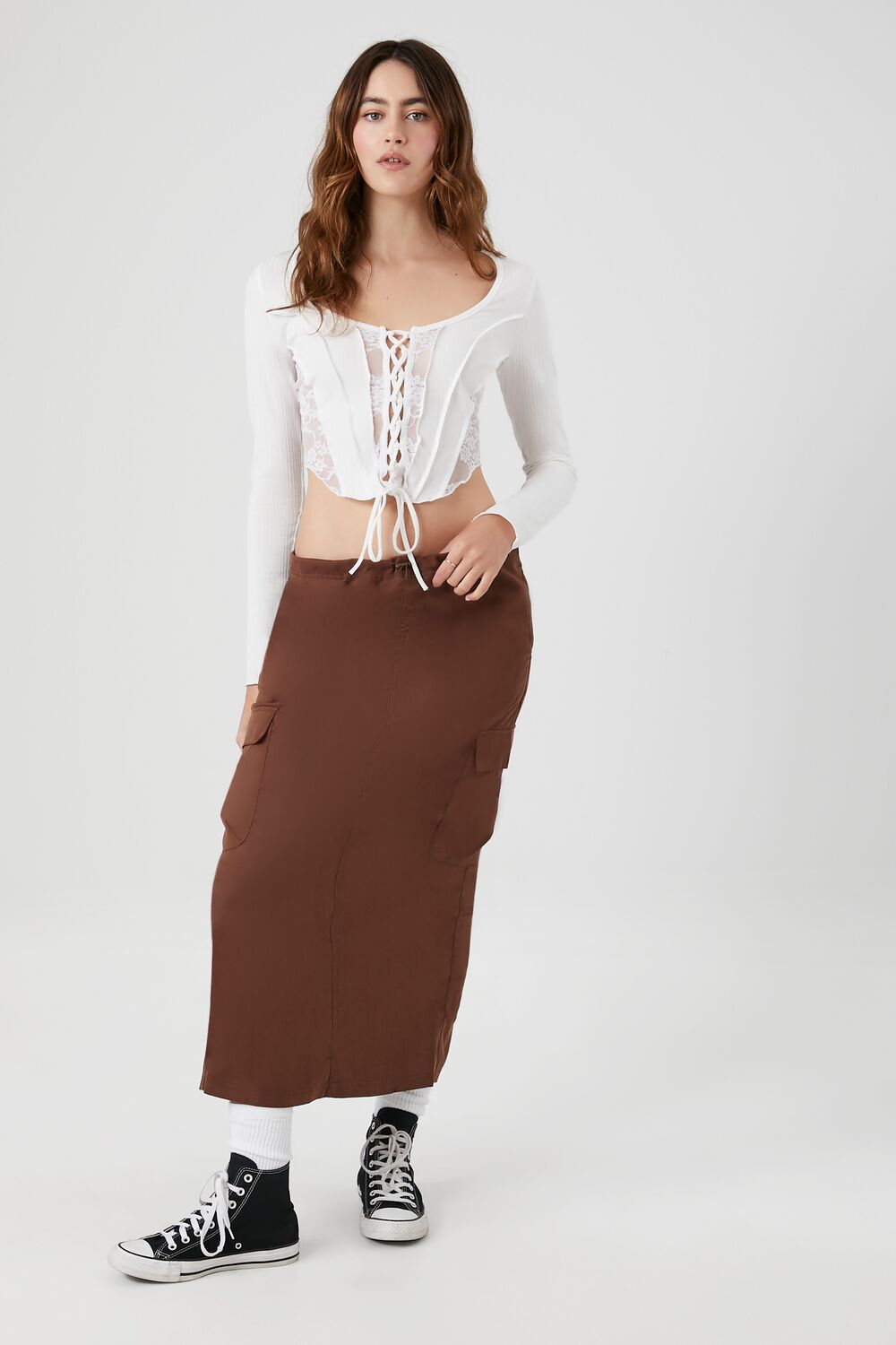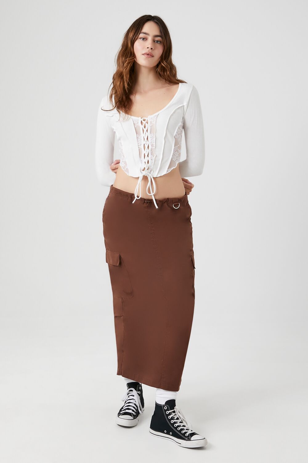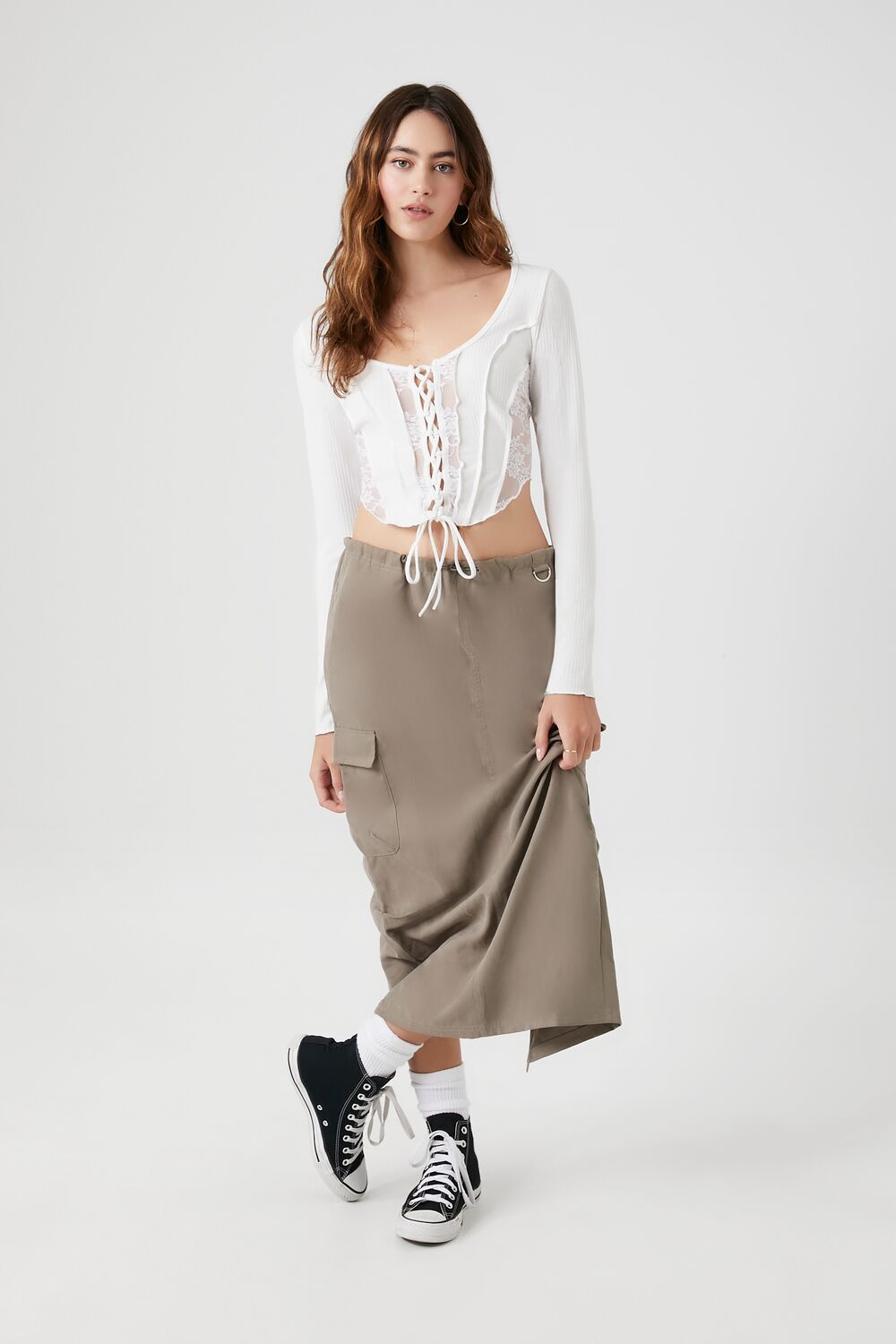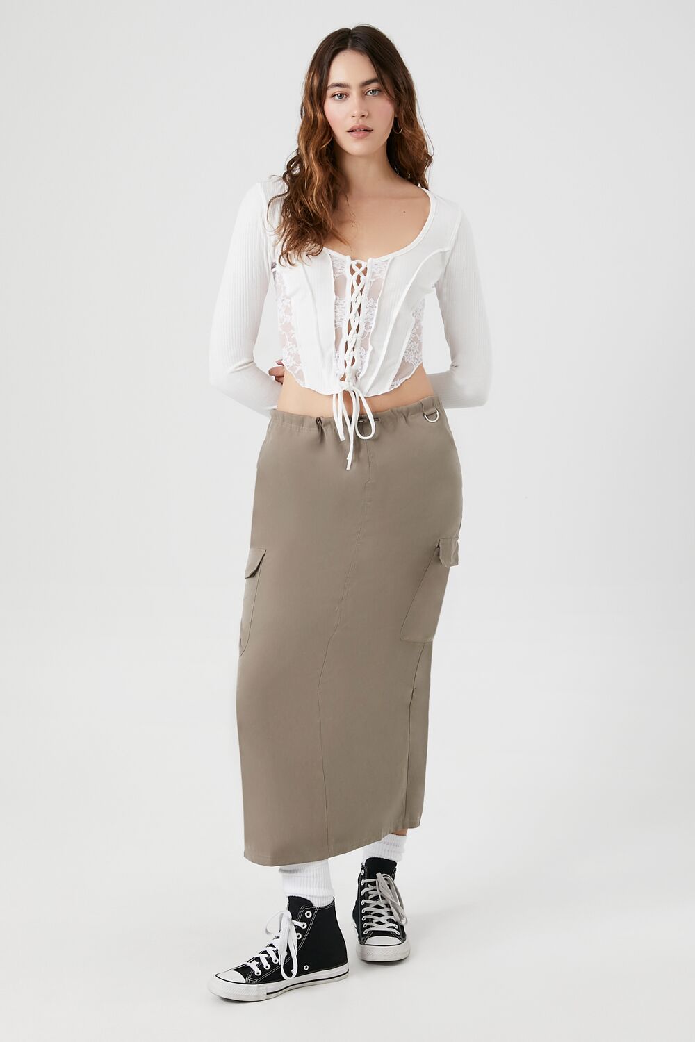A woven maxi skirt featuring cargo flap leg pockets. a drawstring waistband. high-polish D-ring. and a back slit.