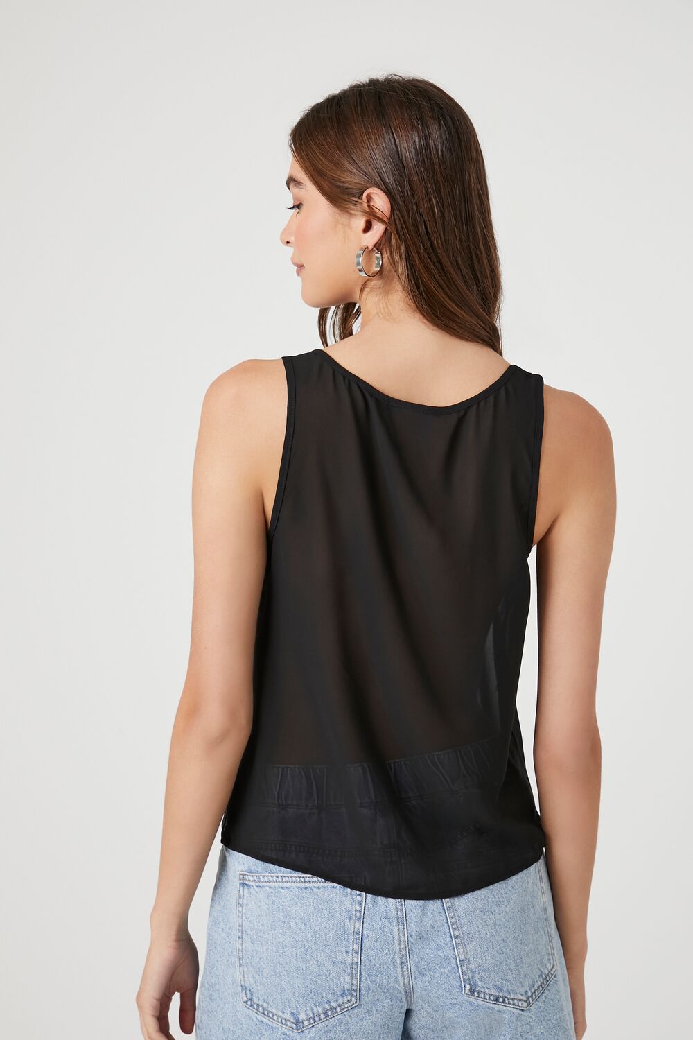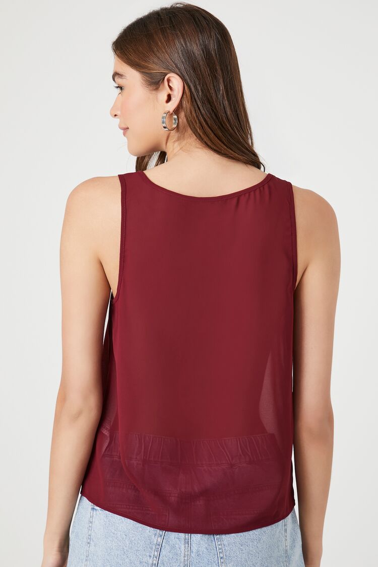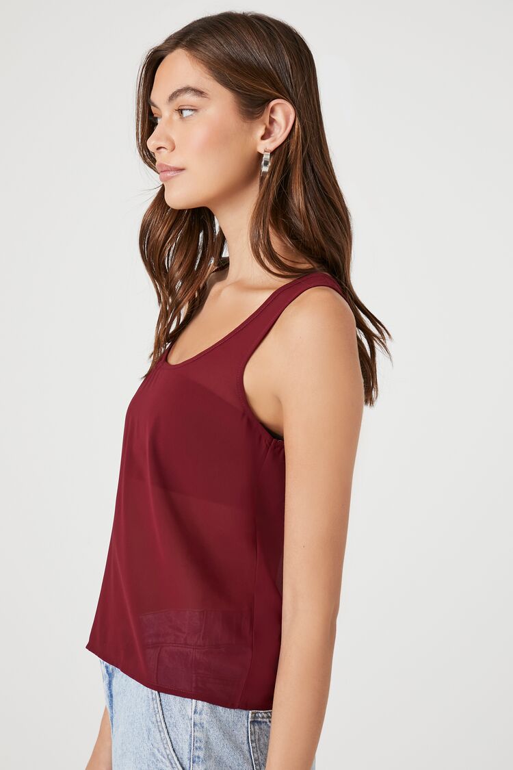 A chiffon tank top featuring a scoop neckline. shoulder straps. and a semi-sheer construction.
