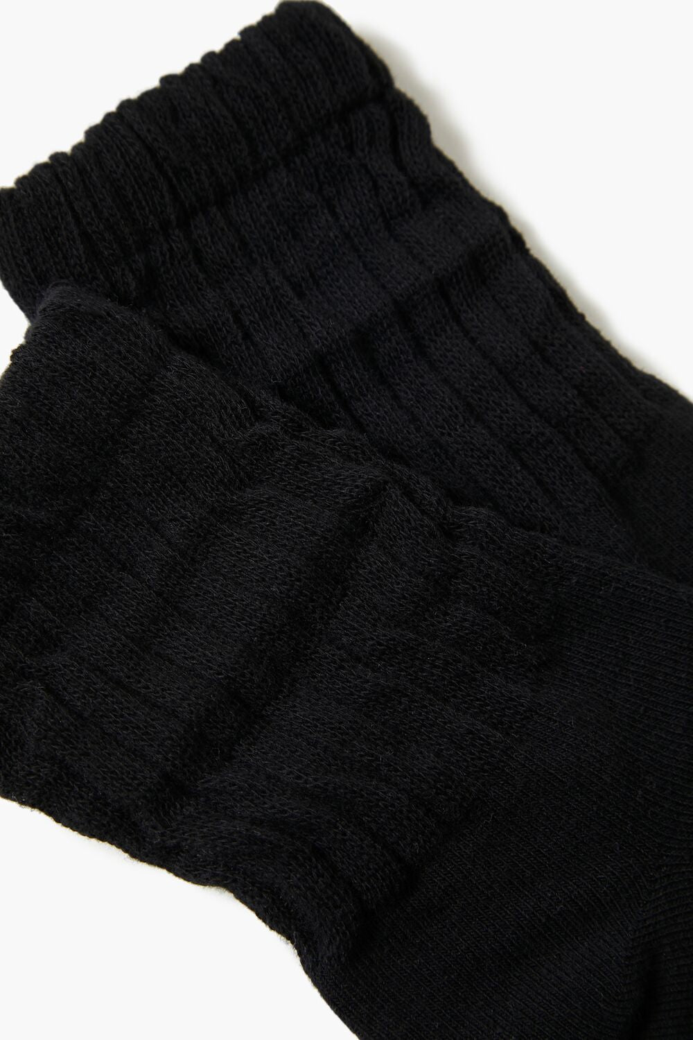 A pair of ribbed knit crew socks featuring a partially crinkled construction.