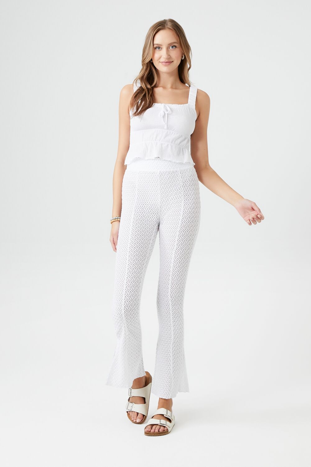 A crochet knit pair of pants featuring an allover chevron pattern. high-rise elasticized waistband. and a flare leg.