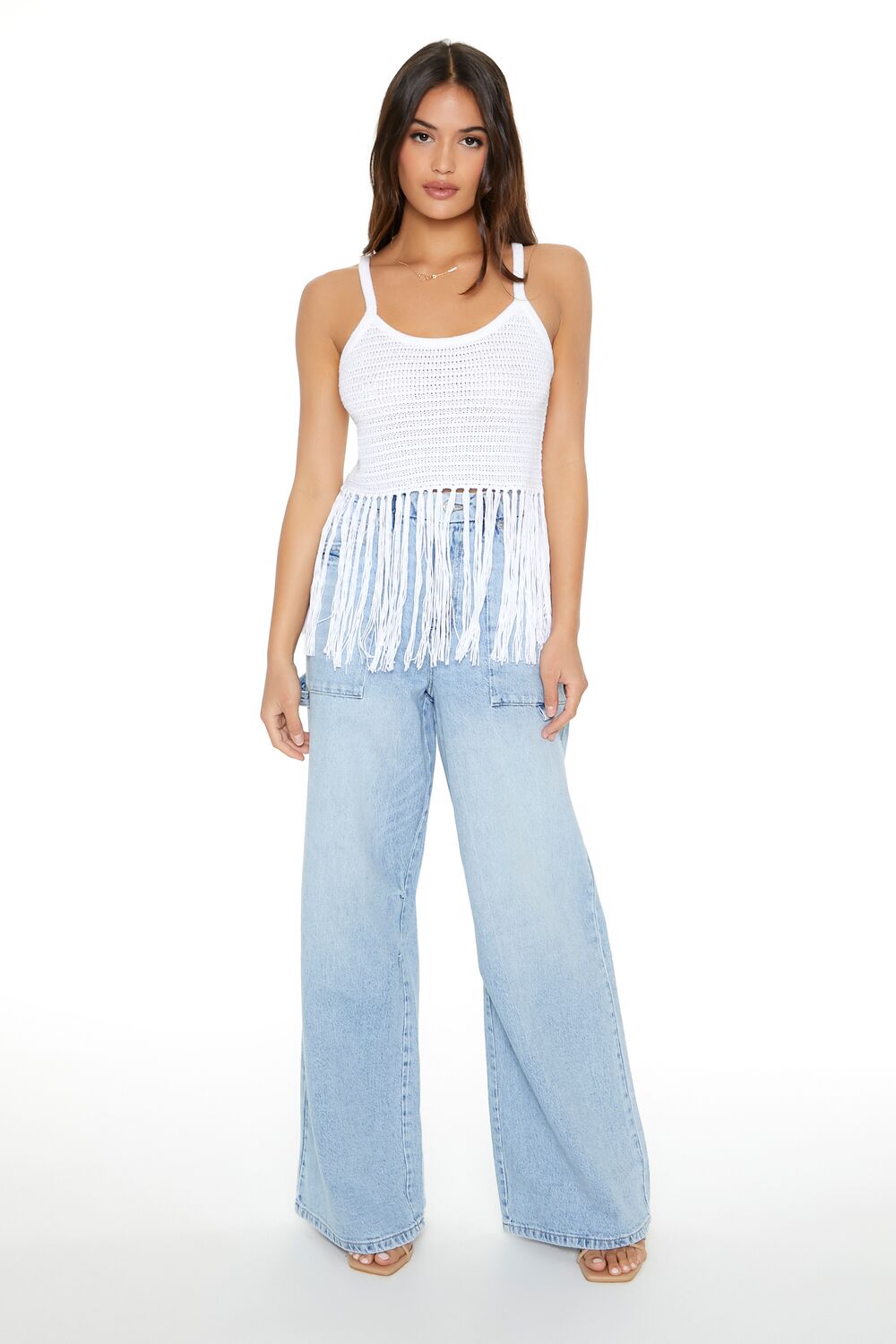 A crochet sweater-knit cami featuring a straight-cut neckline and back. fixed straps. and fringe tassel trim.