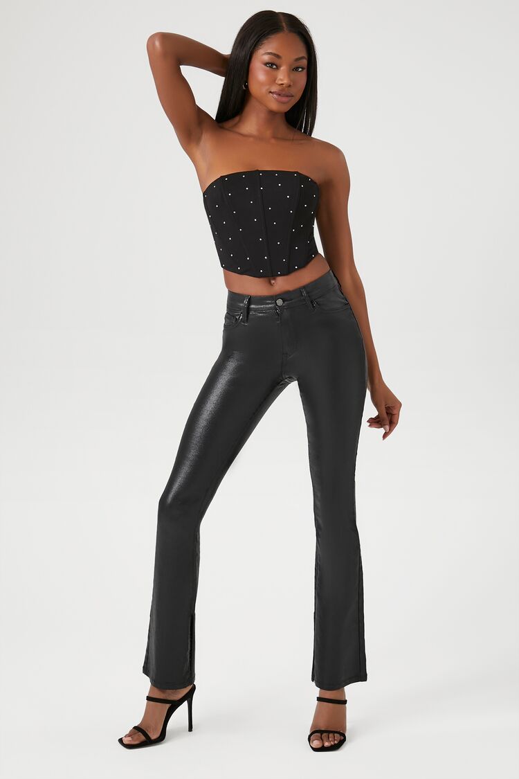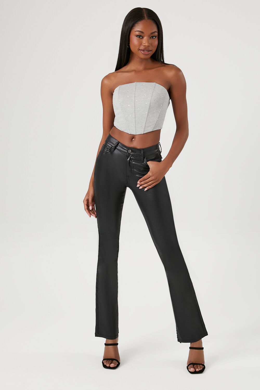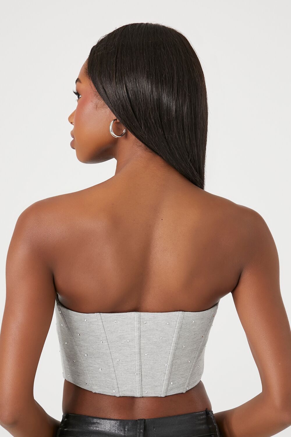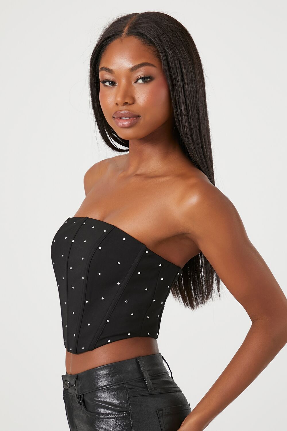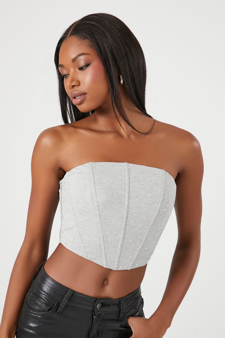 A Ponte knit tube top featuring a corset-inspired design. straight-cut neckline and back. and a curved cropped hem.