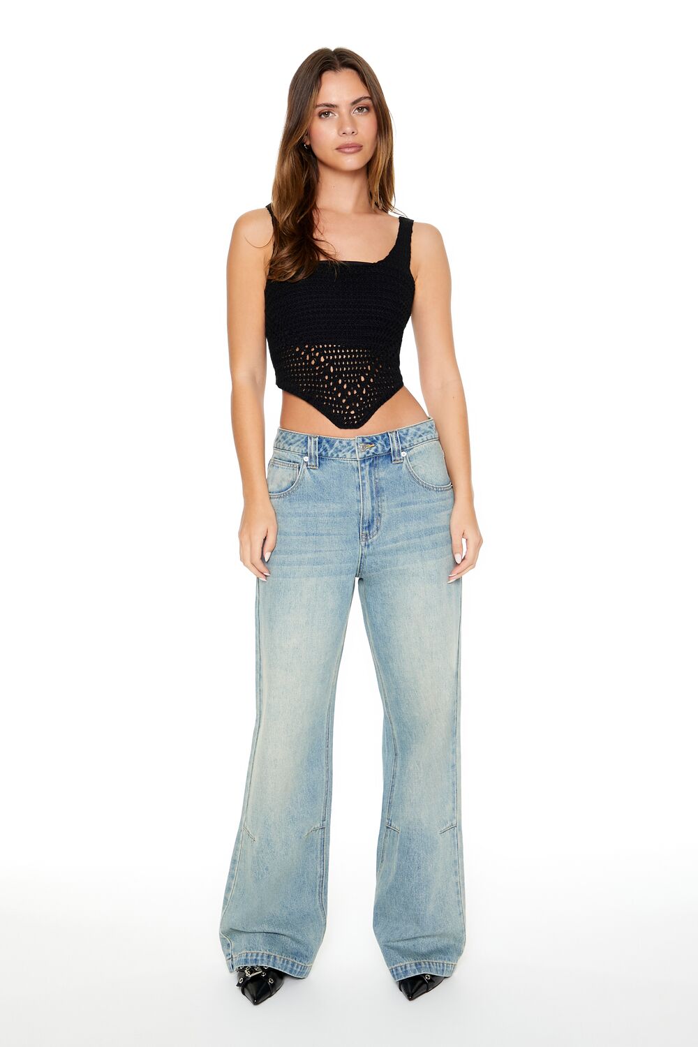 A crochet tank top featuring an open-knit construction. lace-up front closure. square-cut neckline and back. shoulder straps. and cropped hem.