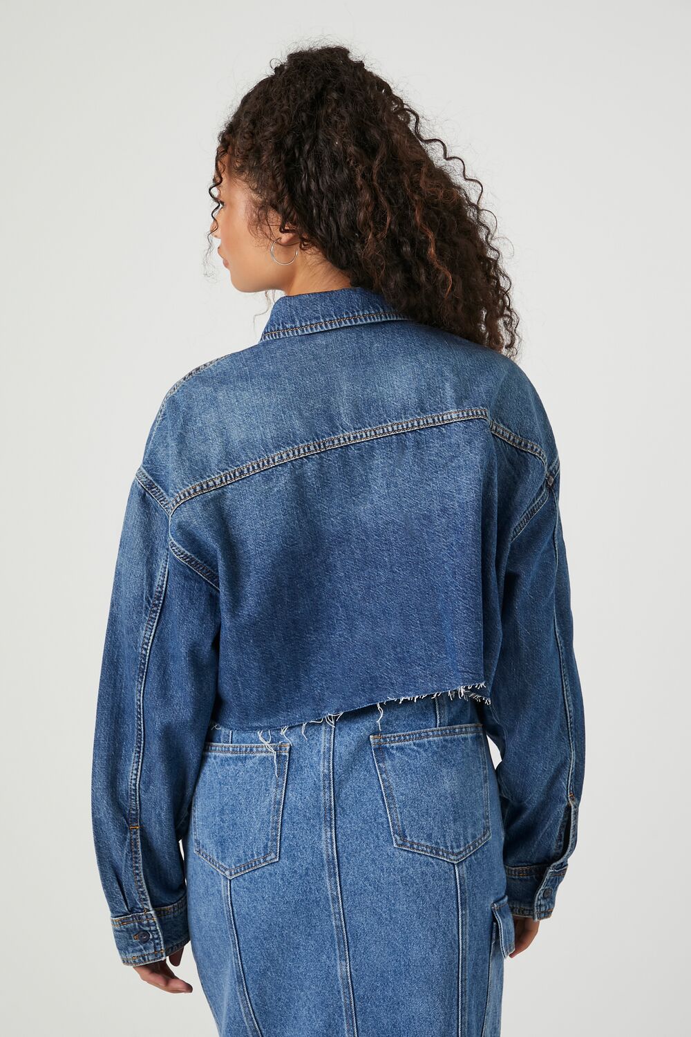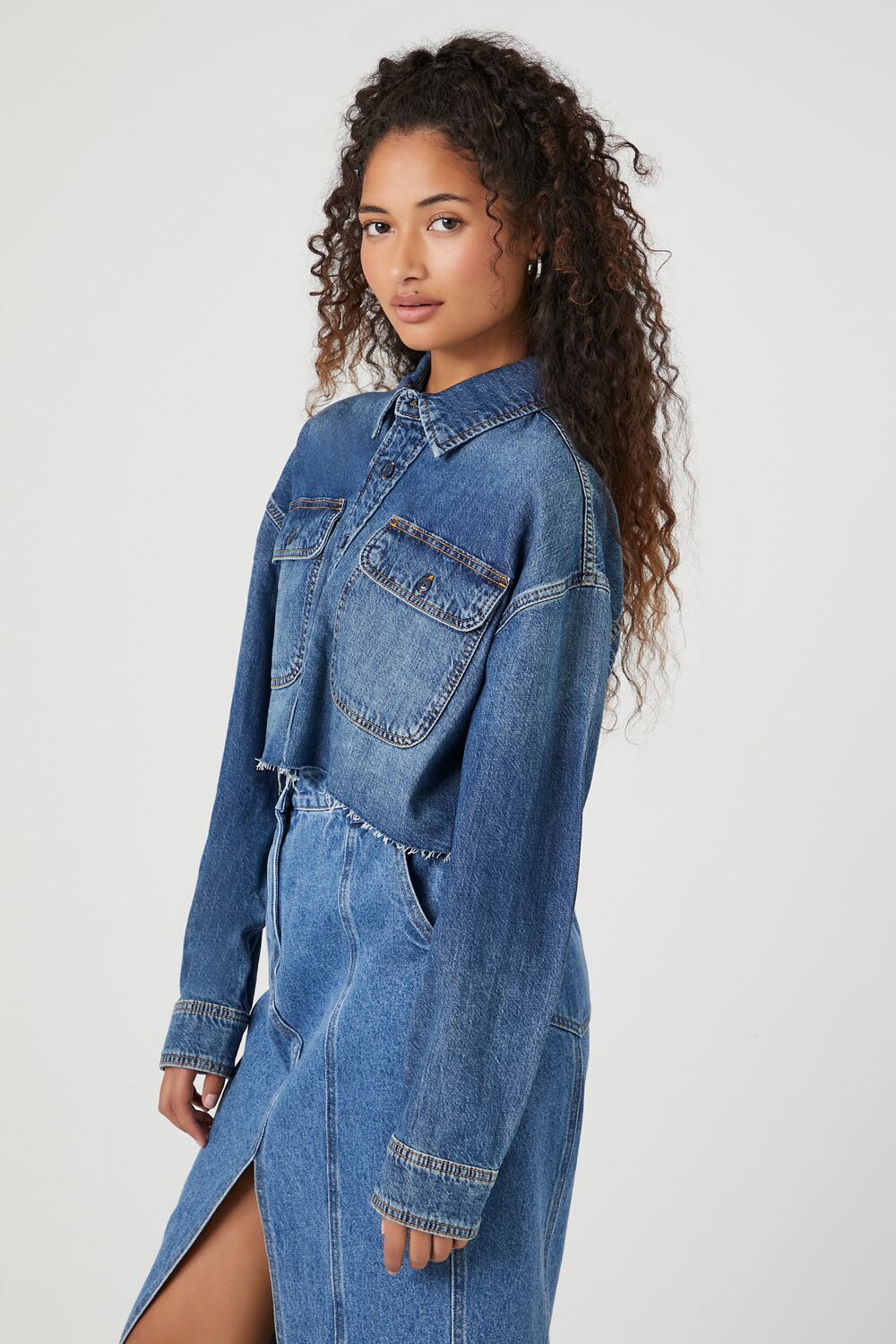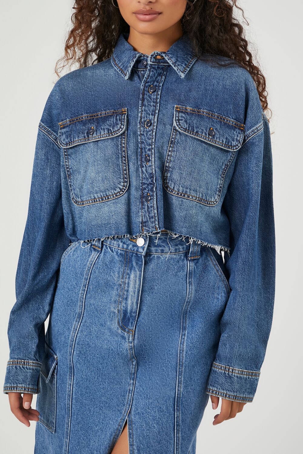 A denim cropped shirt featuring button-front closures. a basic collar. dropped shoulders. long sleeves. front patch pockets. and a frayed hem.