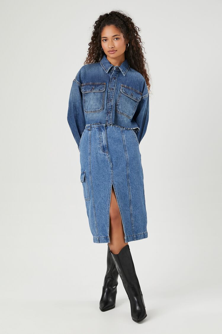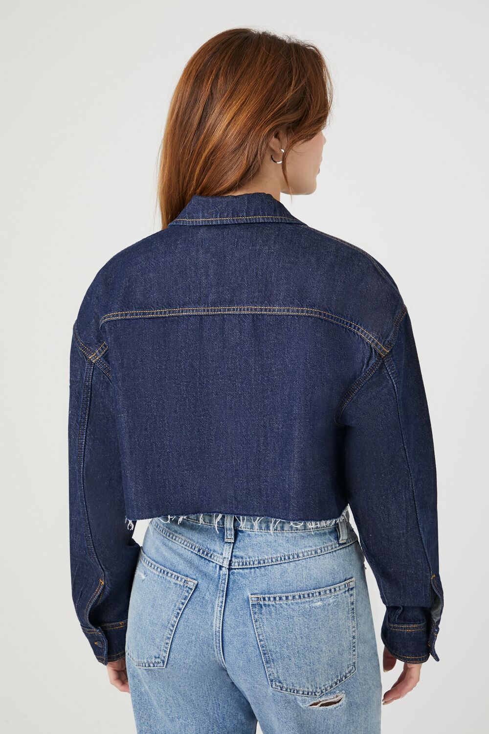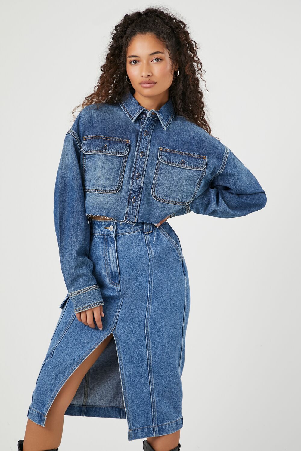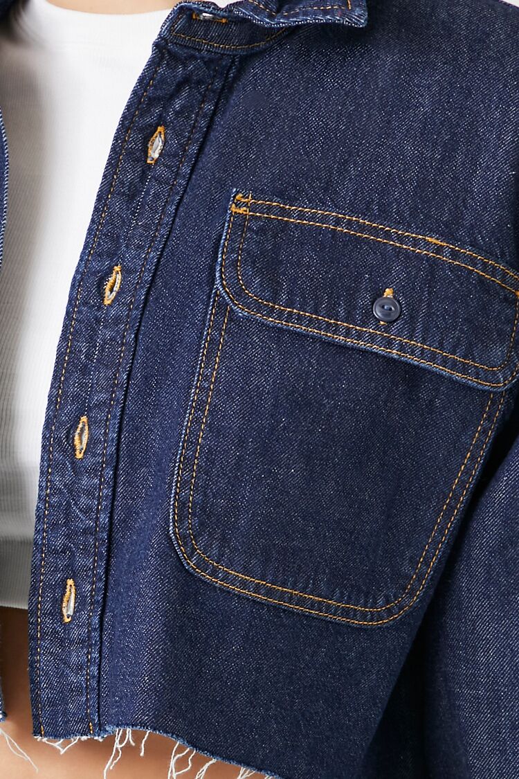 A denim cropped shirt featuring button-front closures. a basic collar. dropped shoulders. long sleeves. front patch pockets. and a frayed hem.