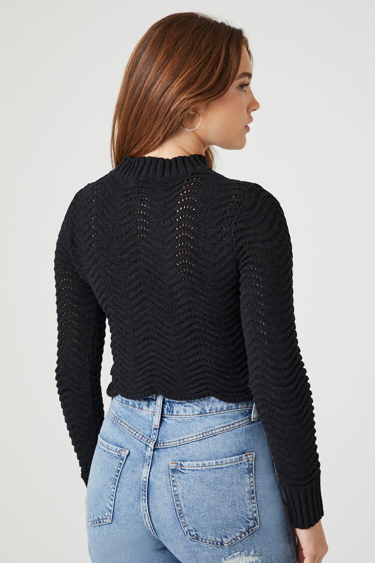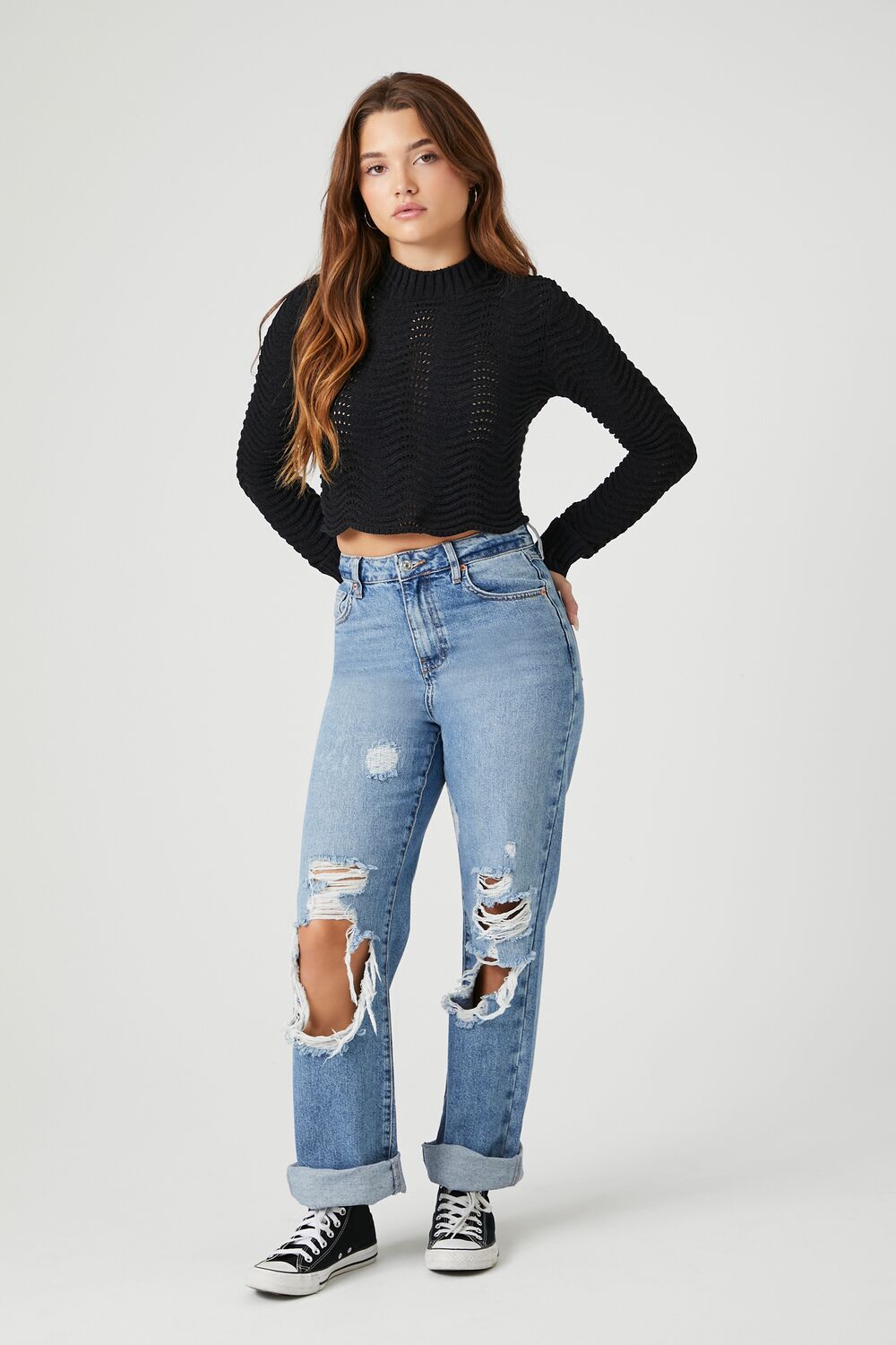 An open-knit sweater featuring a cropped hem. long sleeves. and a round neckline.