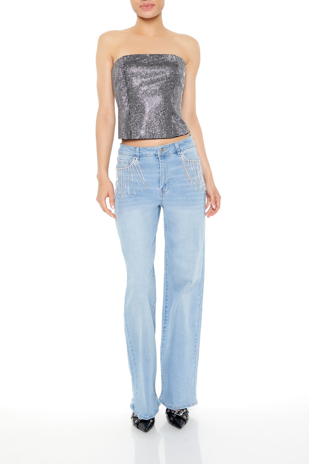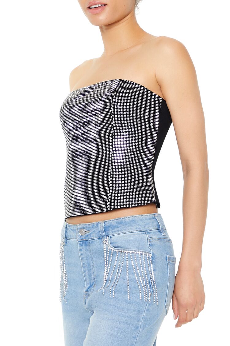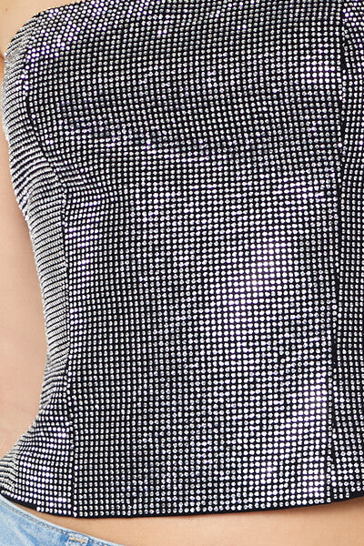 A woven tube top featuring a straight-cut neckline and back. front rhinestone embellishments. and a cropped hem.