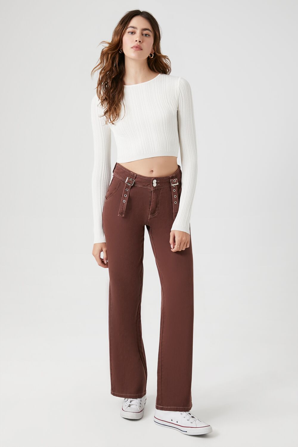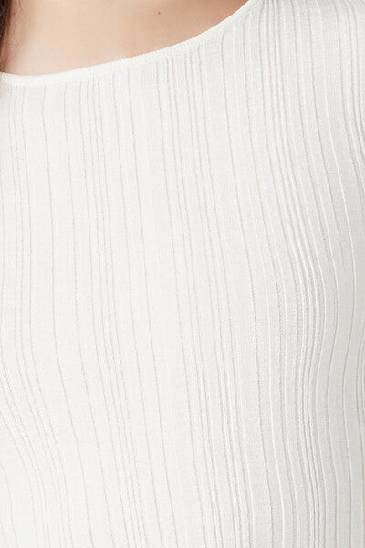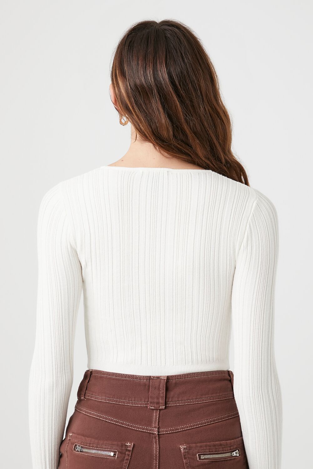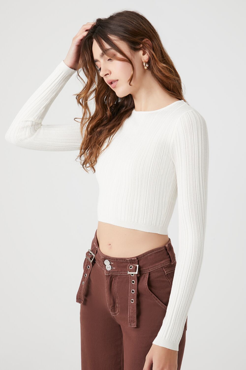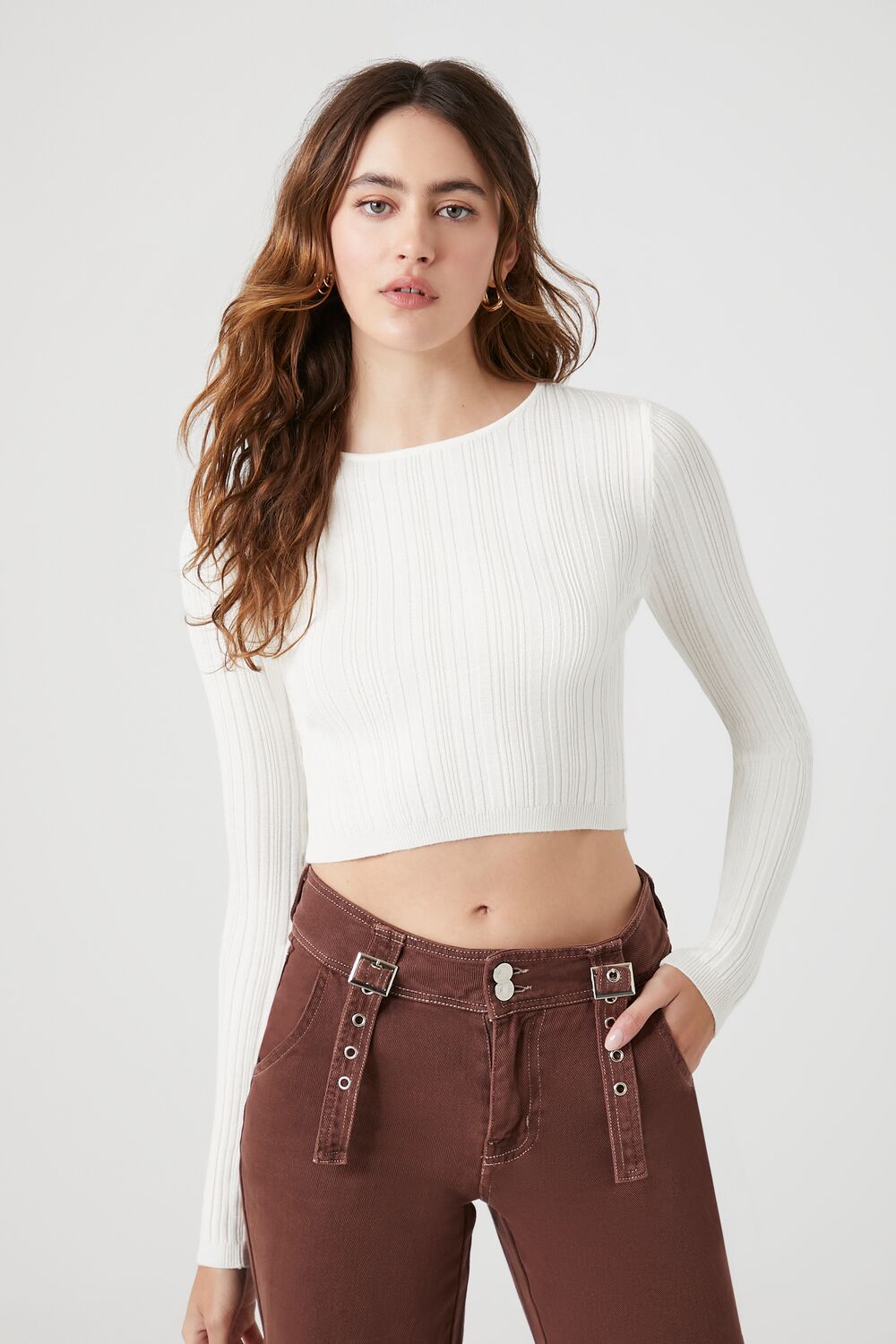 A ribbed knit sweater featuring a round neckline. cropped hem. long sleeves. and fitted silhouette.